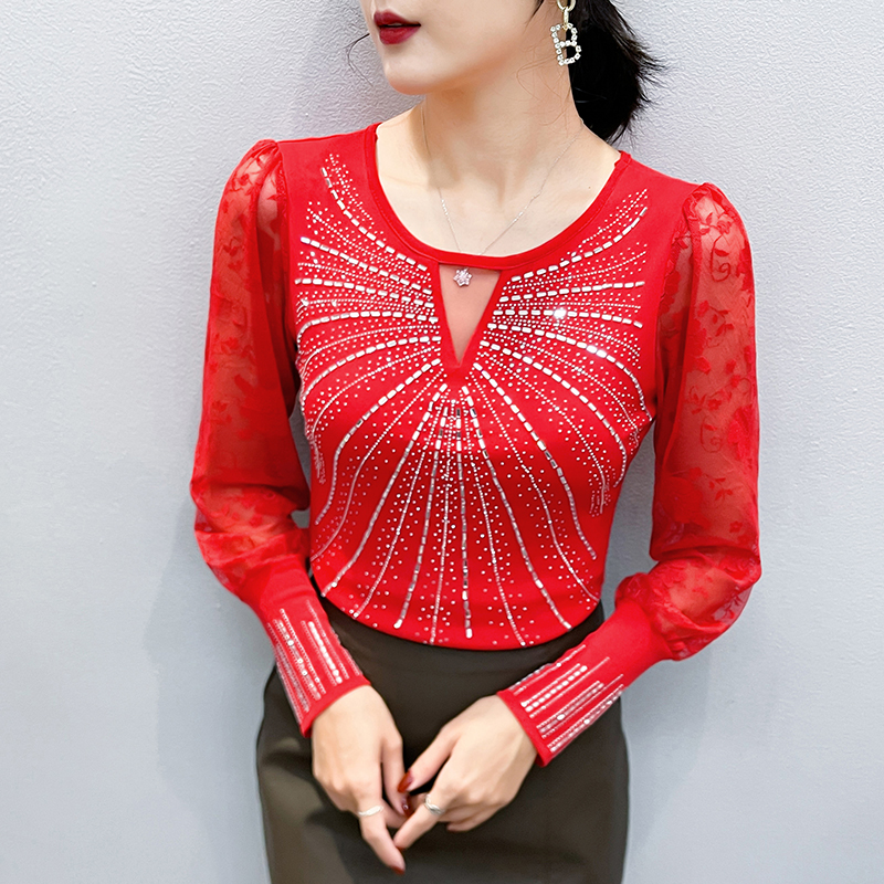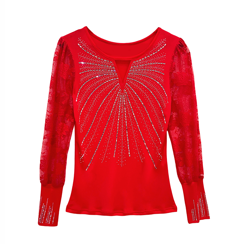 FA55318# 春上新欧洲站重工烫钻个性修身显瘦打底衫蕾丝长袖女潮 服裝批發女裝批發服飾貨源