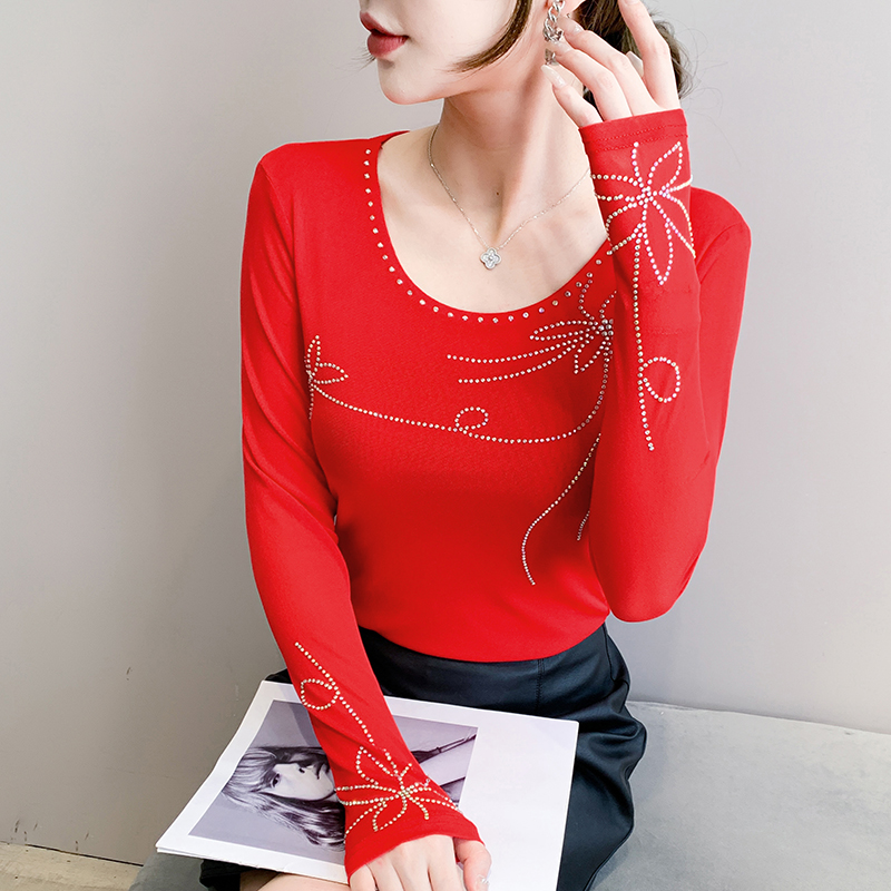 FA55325# 秋季新款圆领网纱时尚重工烫钻百搭修身显瘦长袖女上衣 服裝批發女裝批發服飾貨源