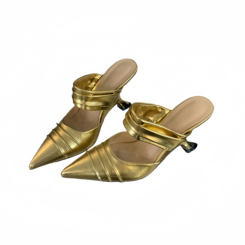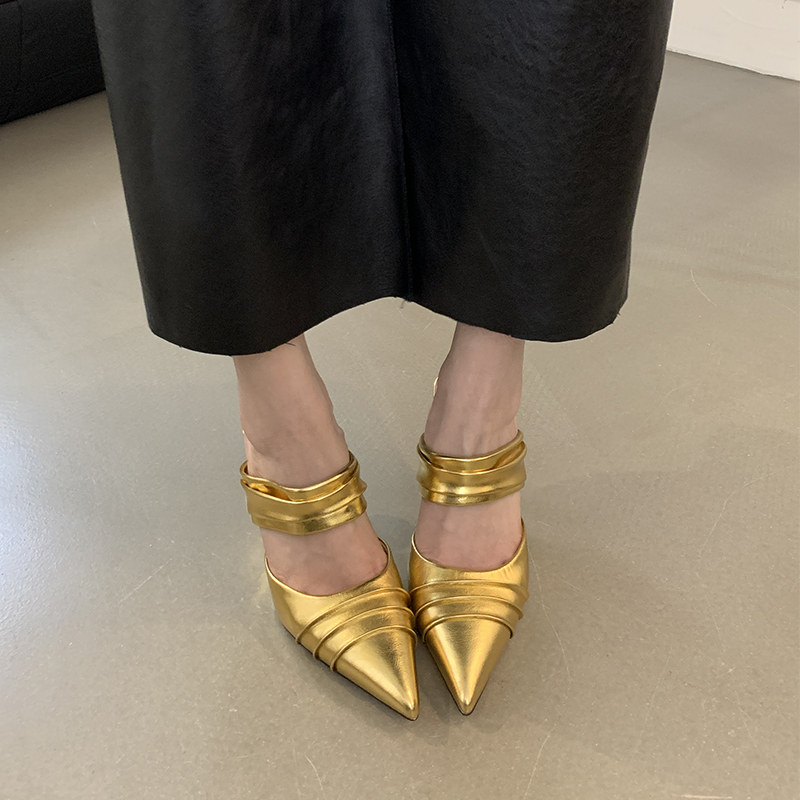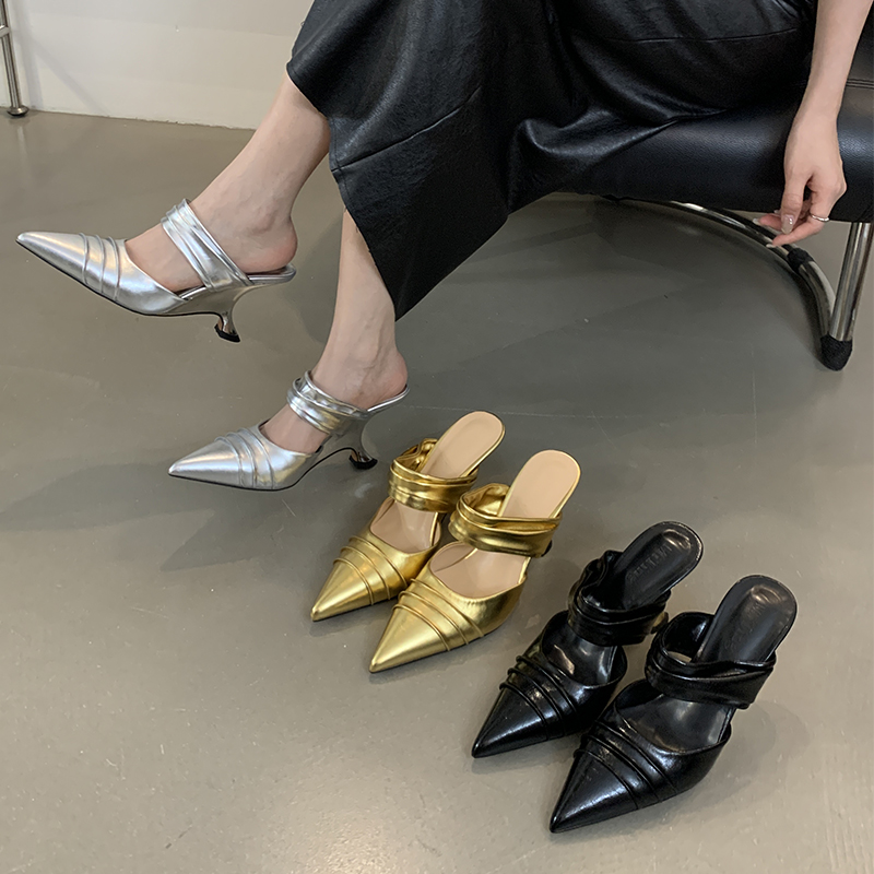 X-33017#法式尖头皱褶包头拖春夏新款坡跟百搭气质时尚高跟半拖鞋 鞋子批发女鞋批发高跟鞋批发