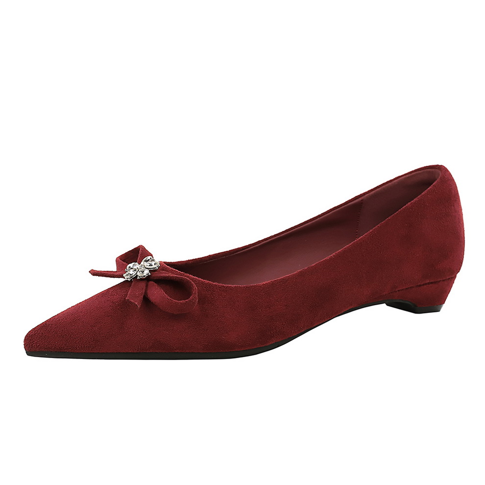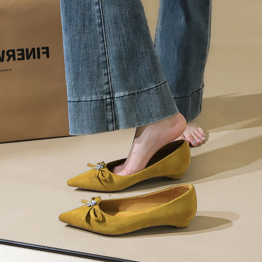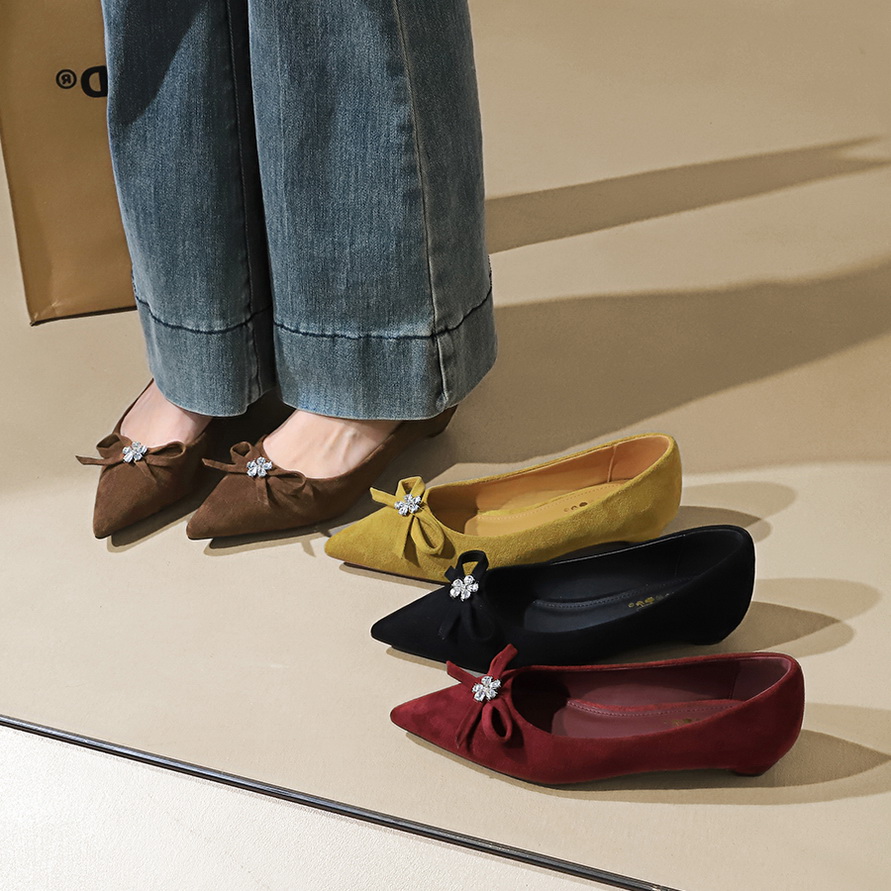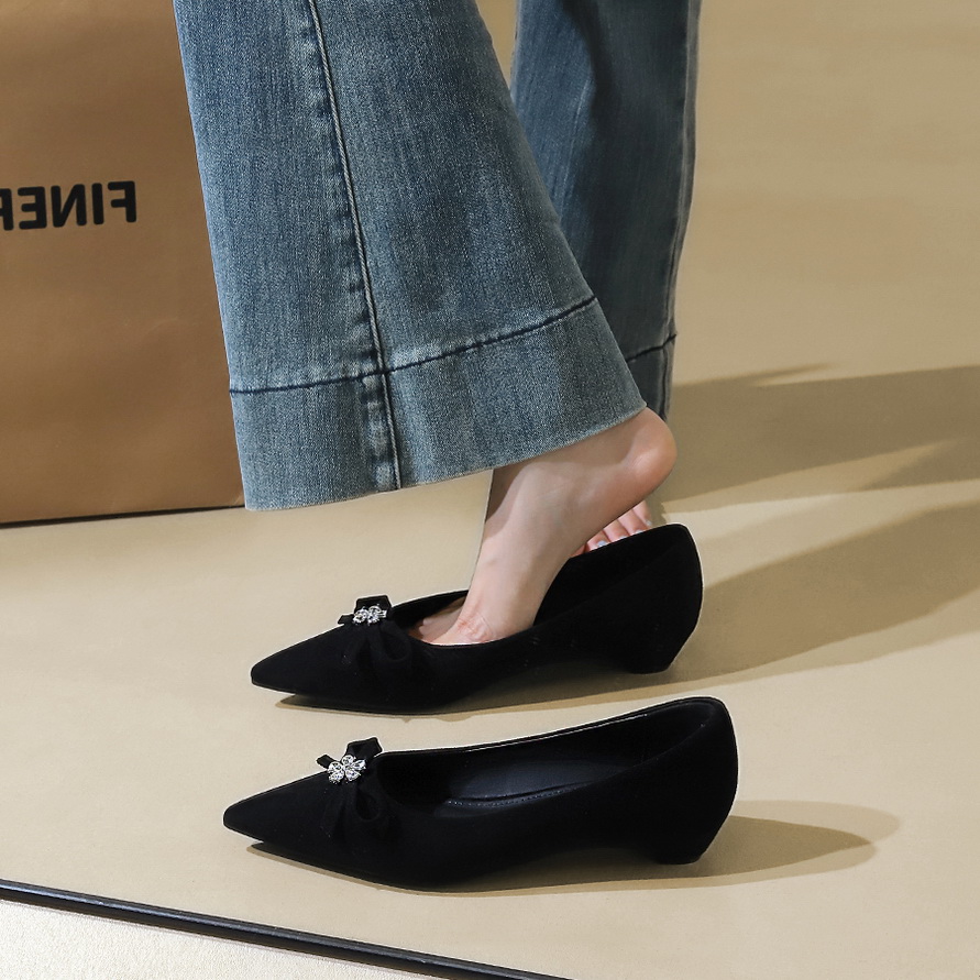X-33053#韩版时尚蝴蝶结水钻小花尖头浅口一脚蹬高级感绒面单鞋女 鞋子批发女鞋批发高跟鞋批发