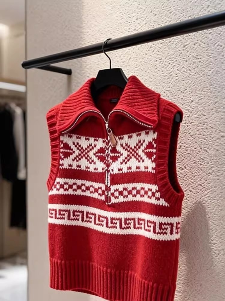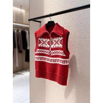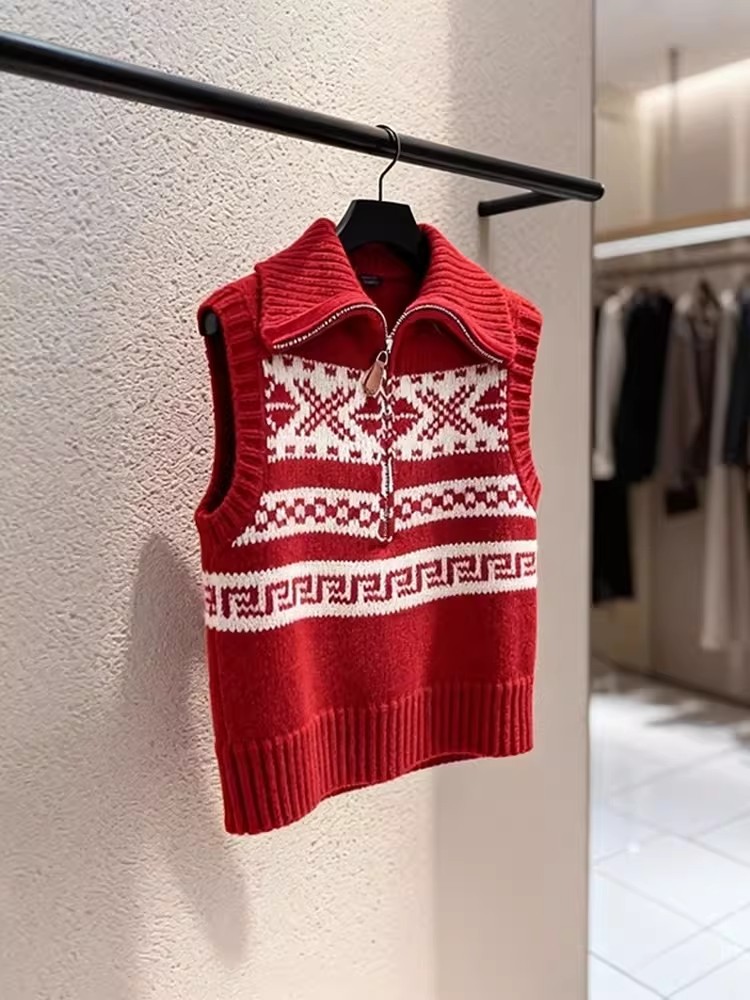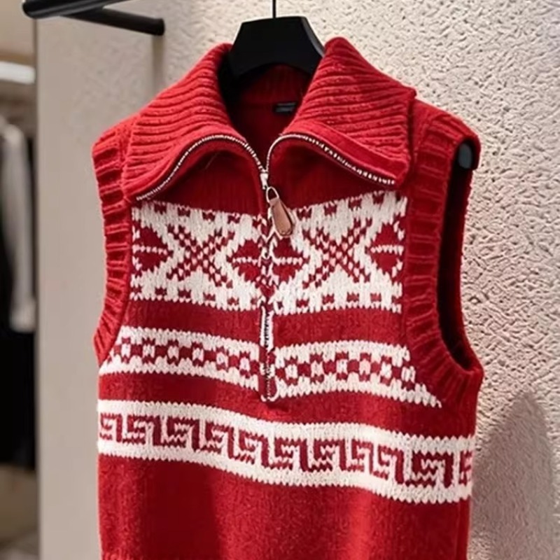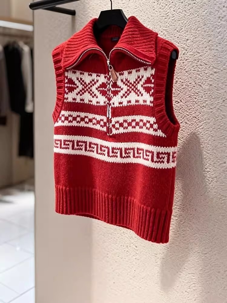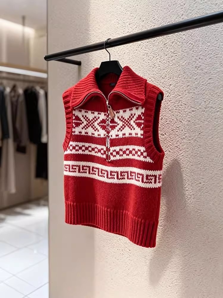 马甲新款今年流行爆款新年韩系减龄红色费尔岛无袖针织马夹女 服裝批發女裝批發服飾貨源