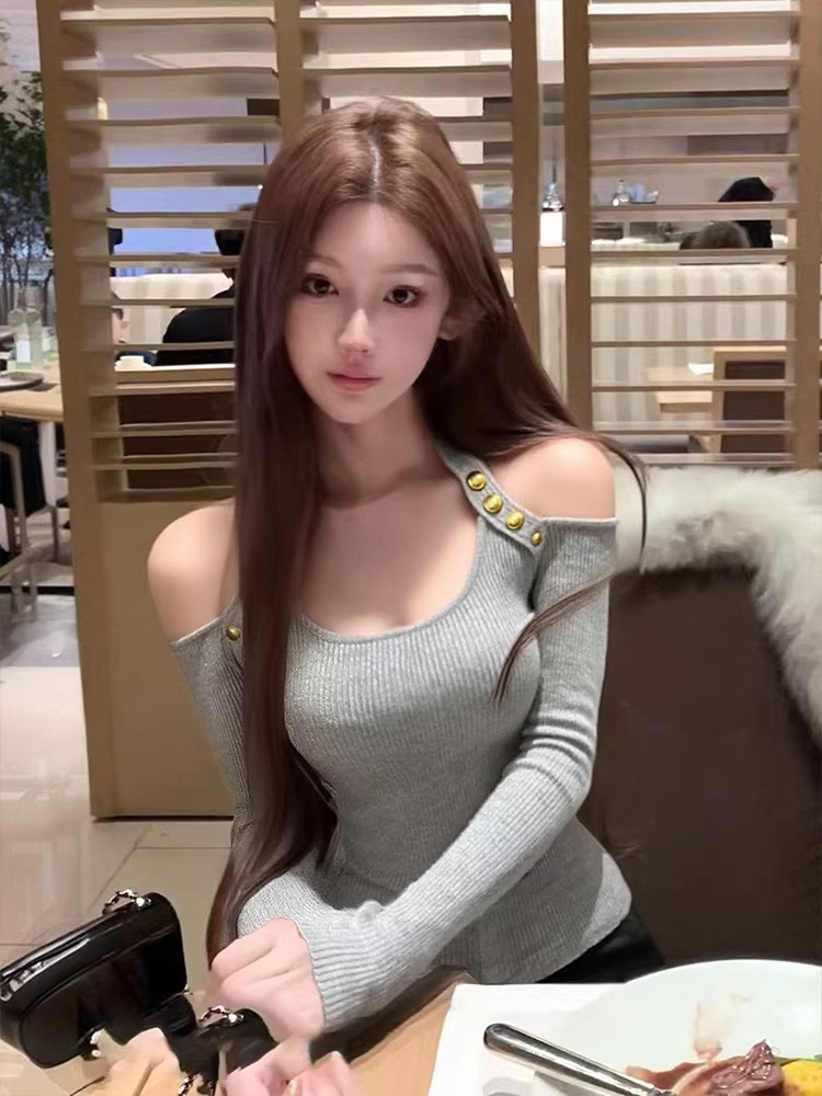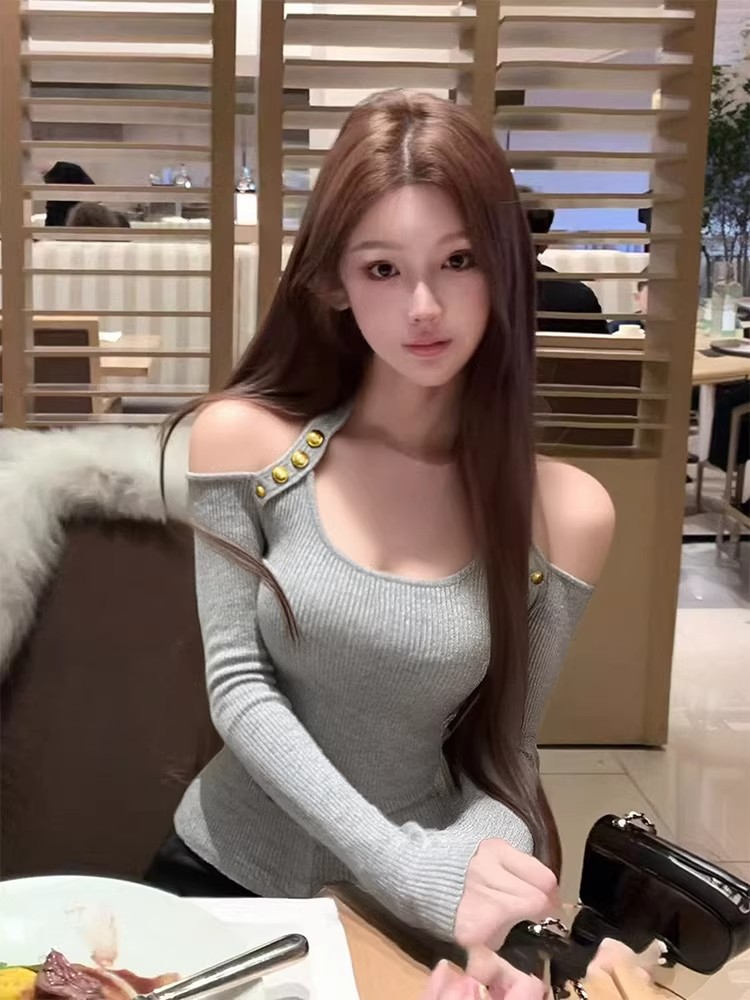 灰色轻奢简约小众性感挂脖一字肩上衣秋季气质显瘦百搭辣妹风长袖 服裝批發女裝批發服飾貨源