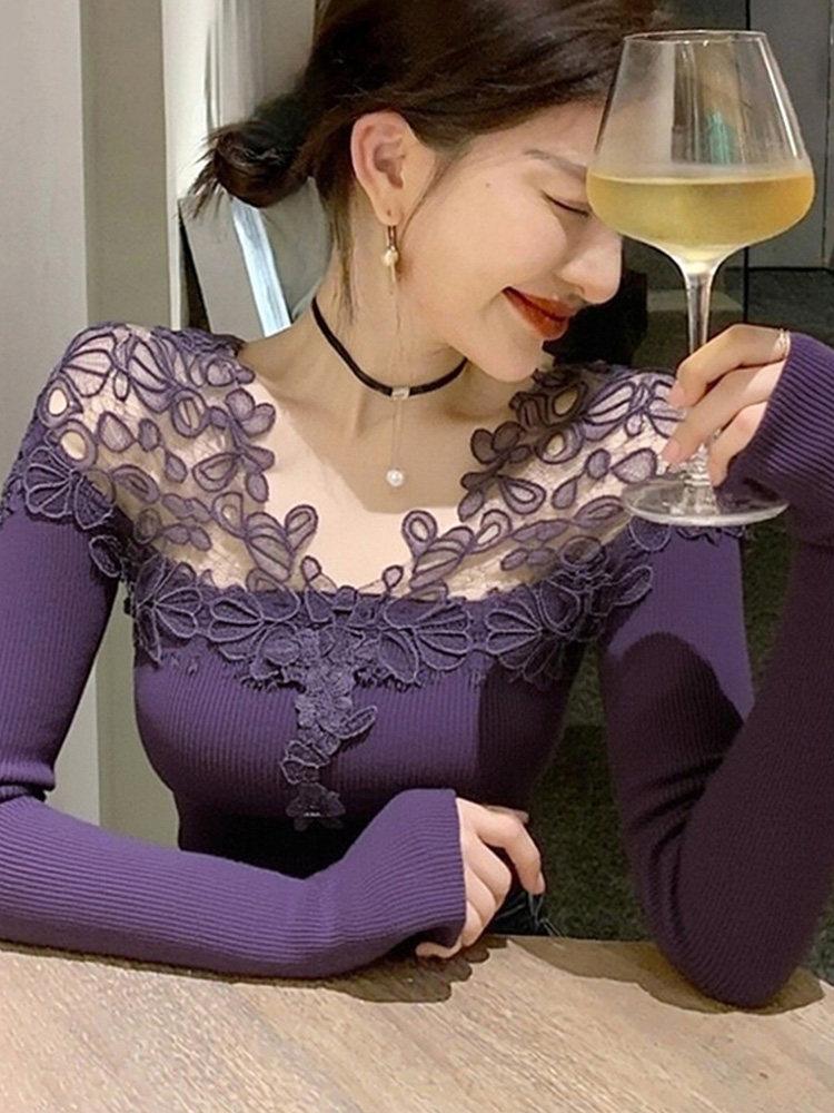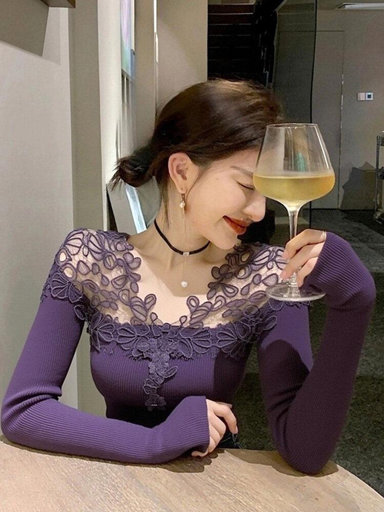 别致独特漂亮内搭紫色蕾丝针织小衫女装秋冬新款洋气高贵露肩上衣 服裝批發女裝批發服飾貨源