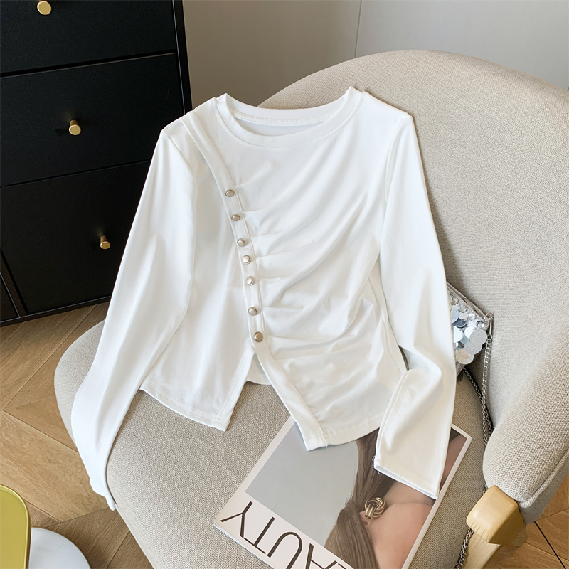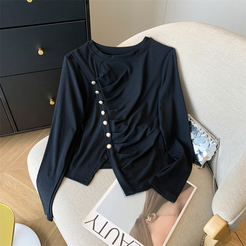 不规则开叉上衣女百搭显瘦褶皱长袖T恤 服裝批發女裝批發服飾貨源