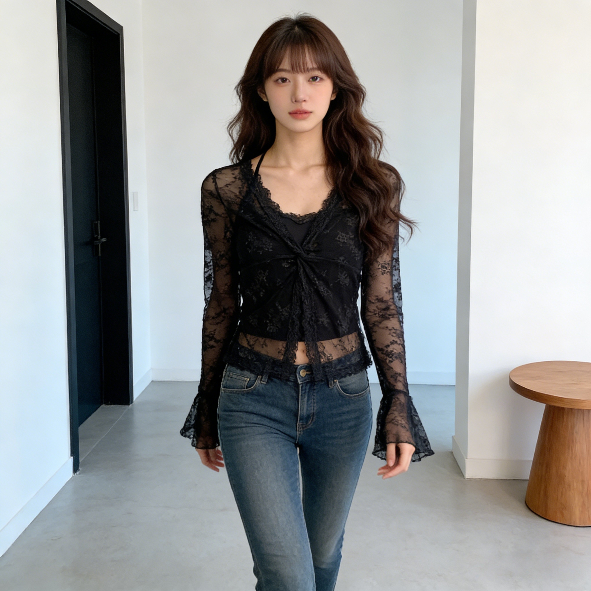 早春人棉纯欲蕾丝假两件喇叭袖T恤修身百搭长袖上衣防晒衫女 服裝批發女裝批發服飾貨源