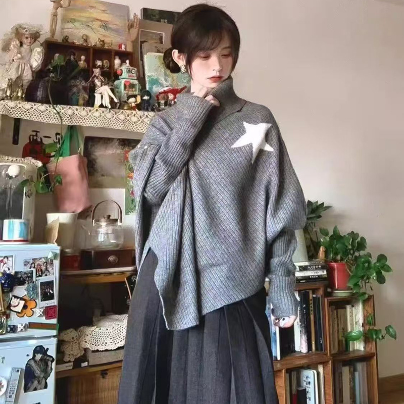 YF6967# 图片色时尚冬装不规则星星长袖高领宽松开叉显瘦蝙蝠袖针织毛衣