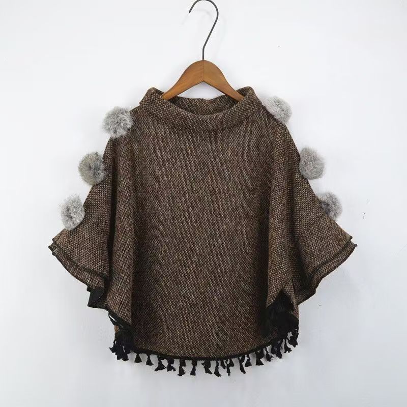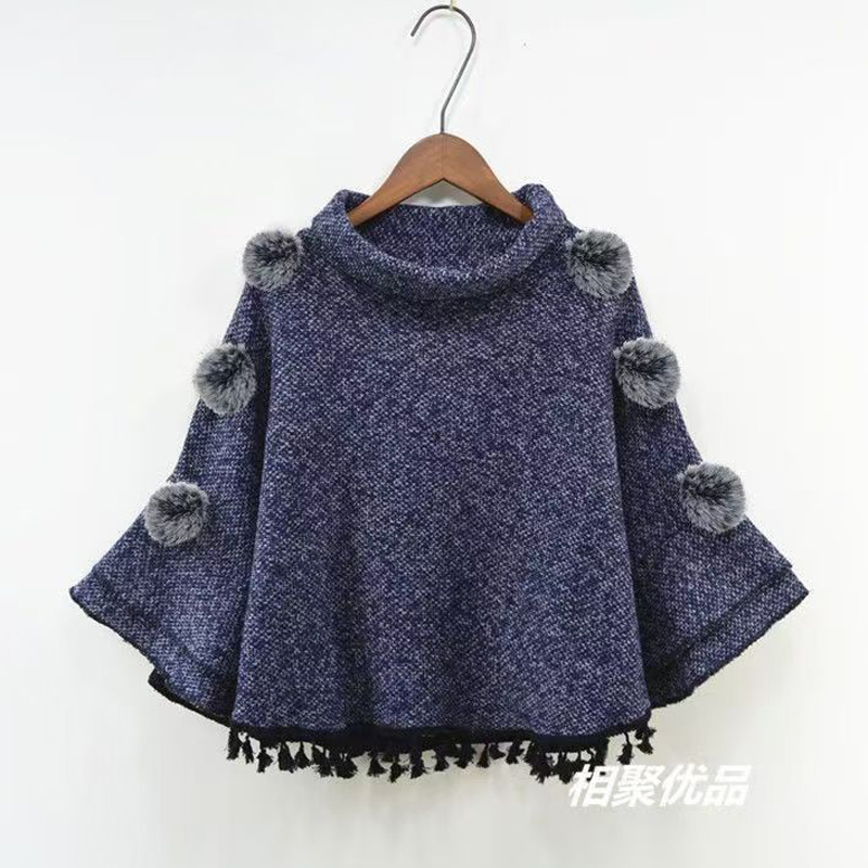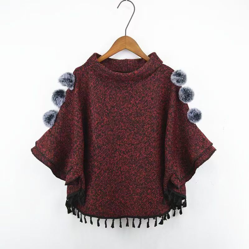 YF6995(4色入内)秋冬蝙蝠袖圆领毛毛球流苏设计感宽松显瘦休闲百搭斗篷披肩