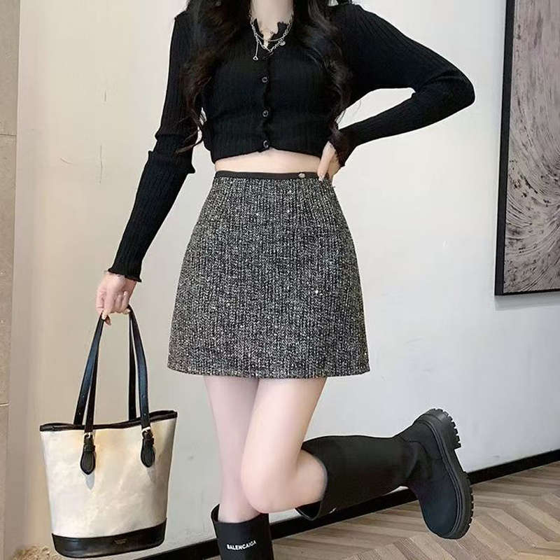 YF7001# 图片色秋冬亮片粗毛呢设计A字包臀显瘦韩版复古小香风半身裙