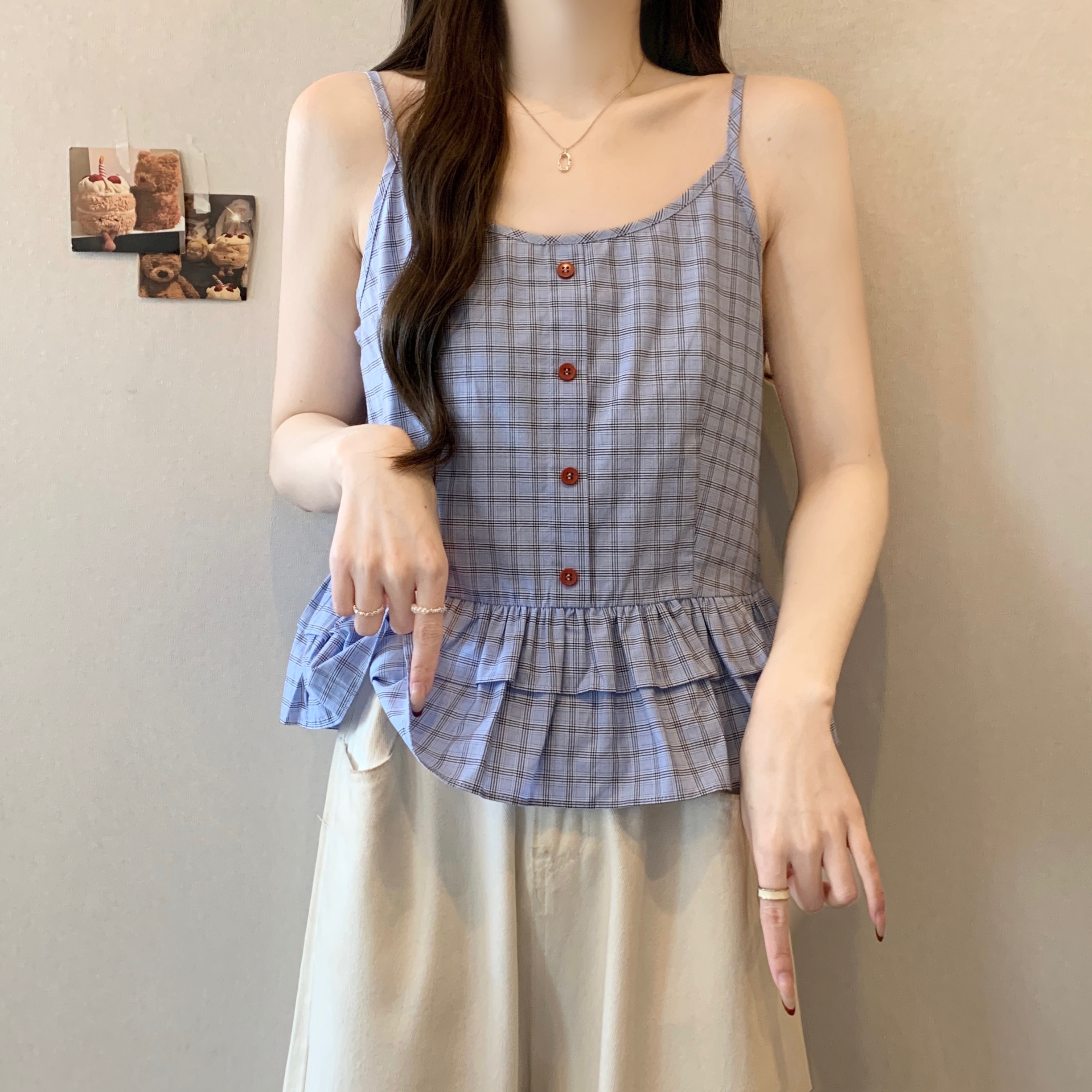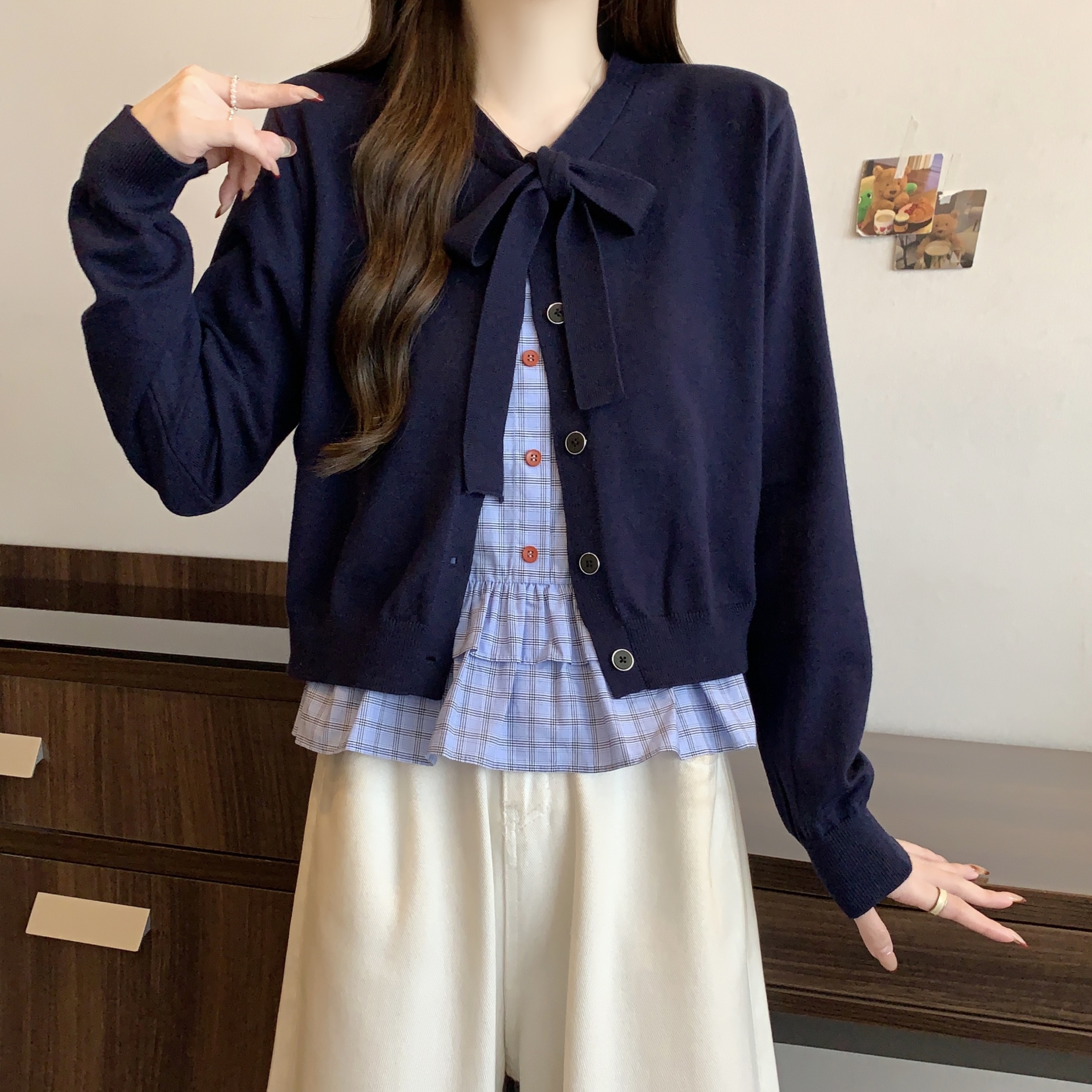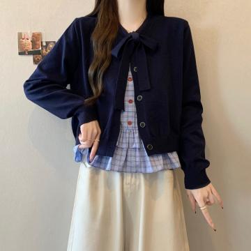 FA56305# 大码套装女miu系春新款蝴蝶结开衫格纹荷叶边吊带上衣两件套 服裝批發女裝批發服飾貨源