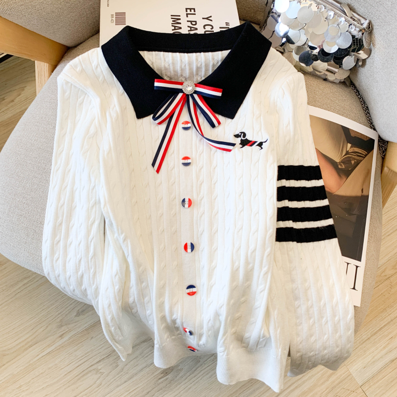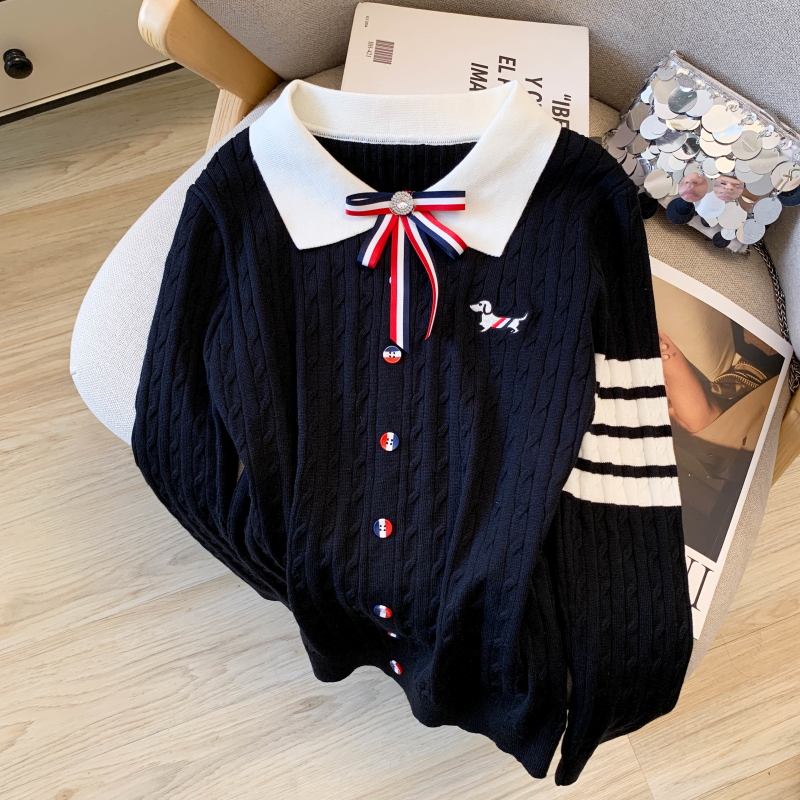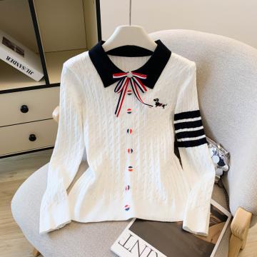 首页 > 毛衣、针织衫 > FA56384# 轻奢香风蝴蝶结翻领套头针织衫女春秋小狗刺绣四杠长袖POLO衫上衣 服裝批發女裝批發服飾貨源