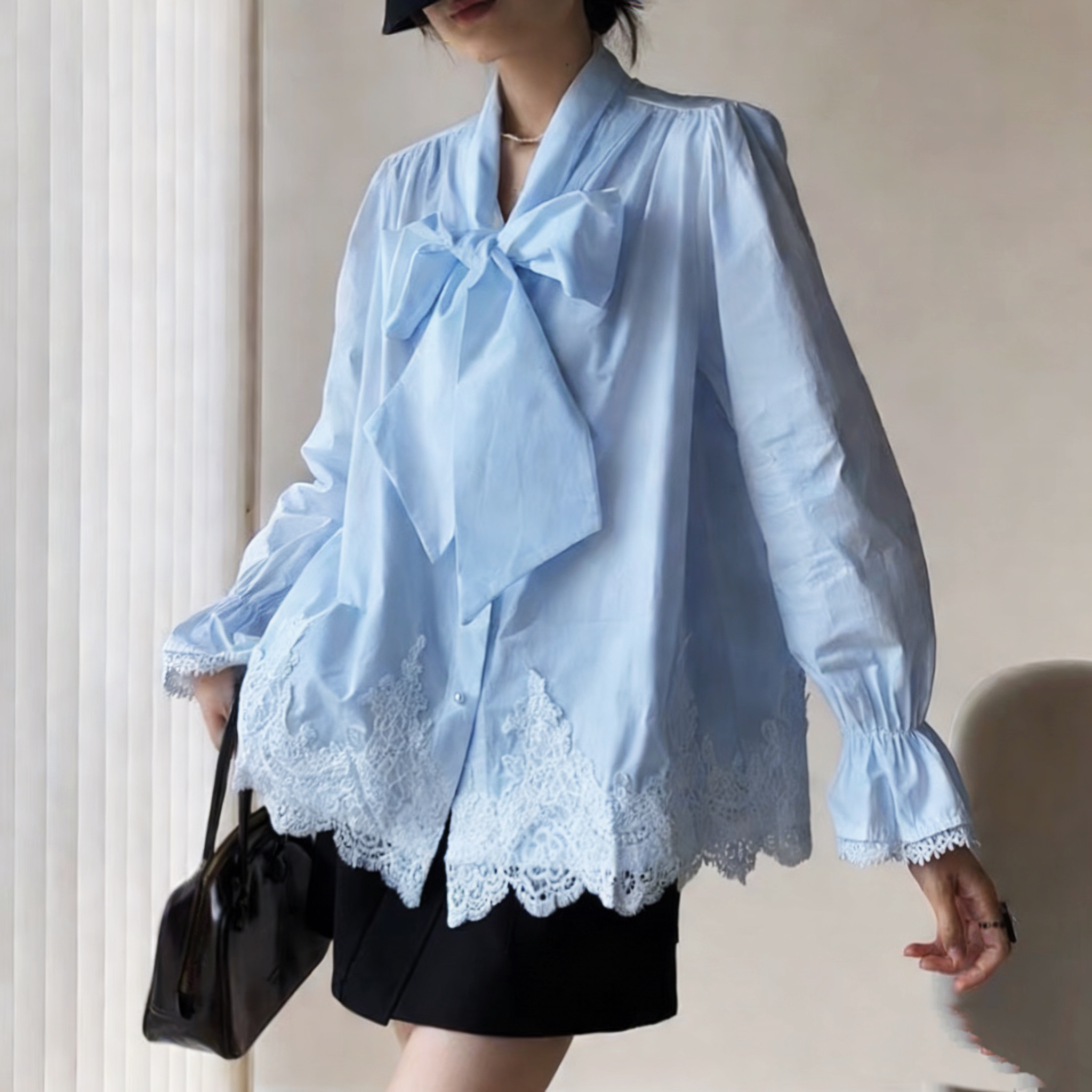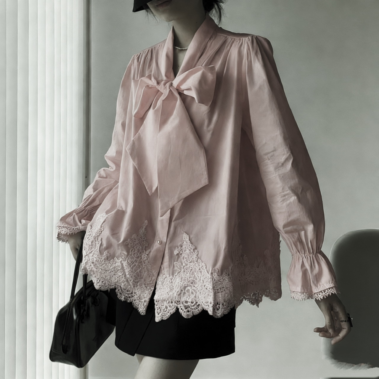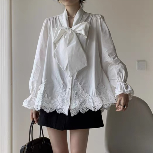 FA56480# 报单有货春天法式蝴蝶结绑带宽松显瘦遮肉衬衫刺绣镂空钩花上衣 服裝批發女裝批發服飾貨源