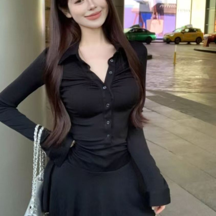 FA56489# 美式Polo领黑色长袖连衣裙纯欲辣妹褶皱运动修身收腰显瘦短裙裙子 服裝批發女裝批發服飾貨源