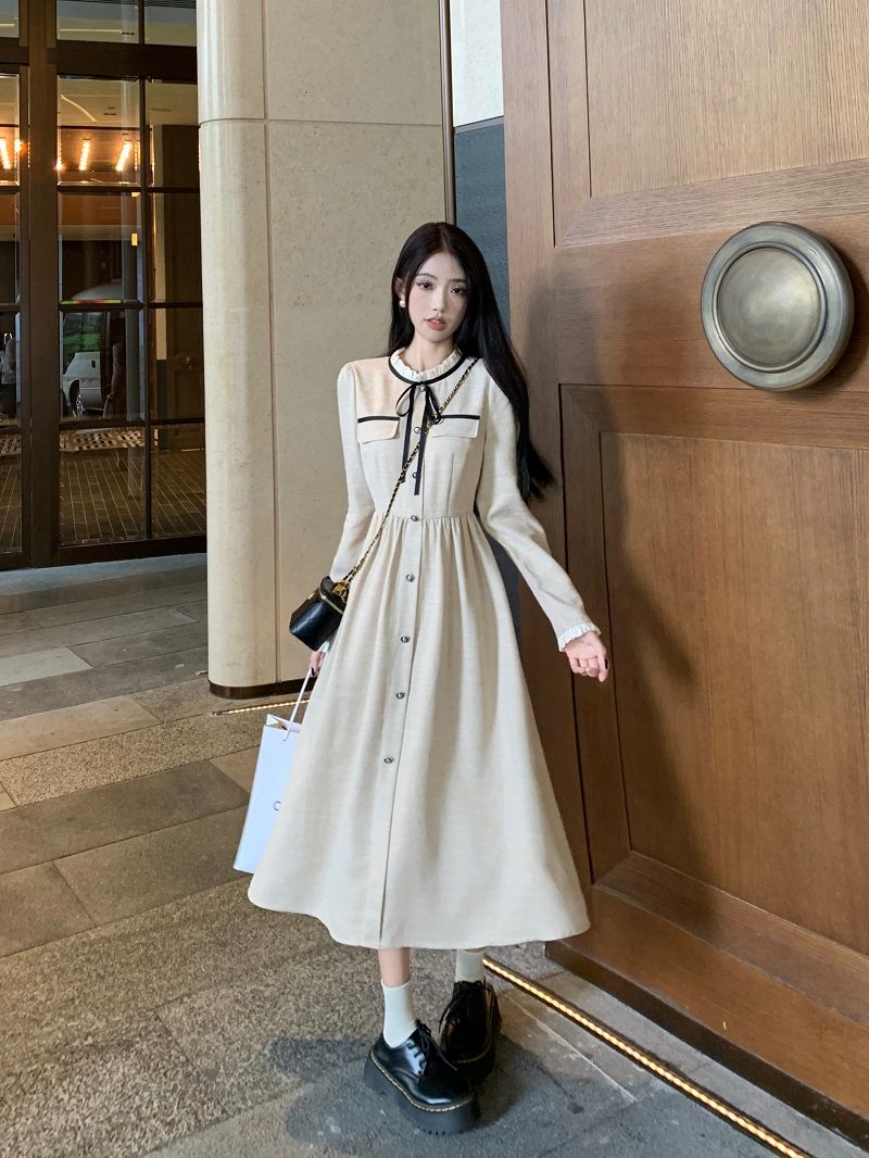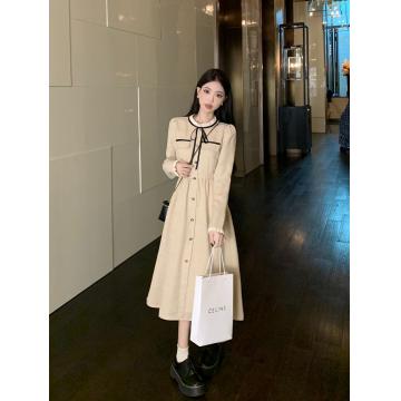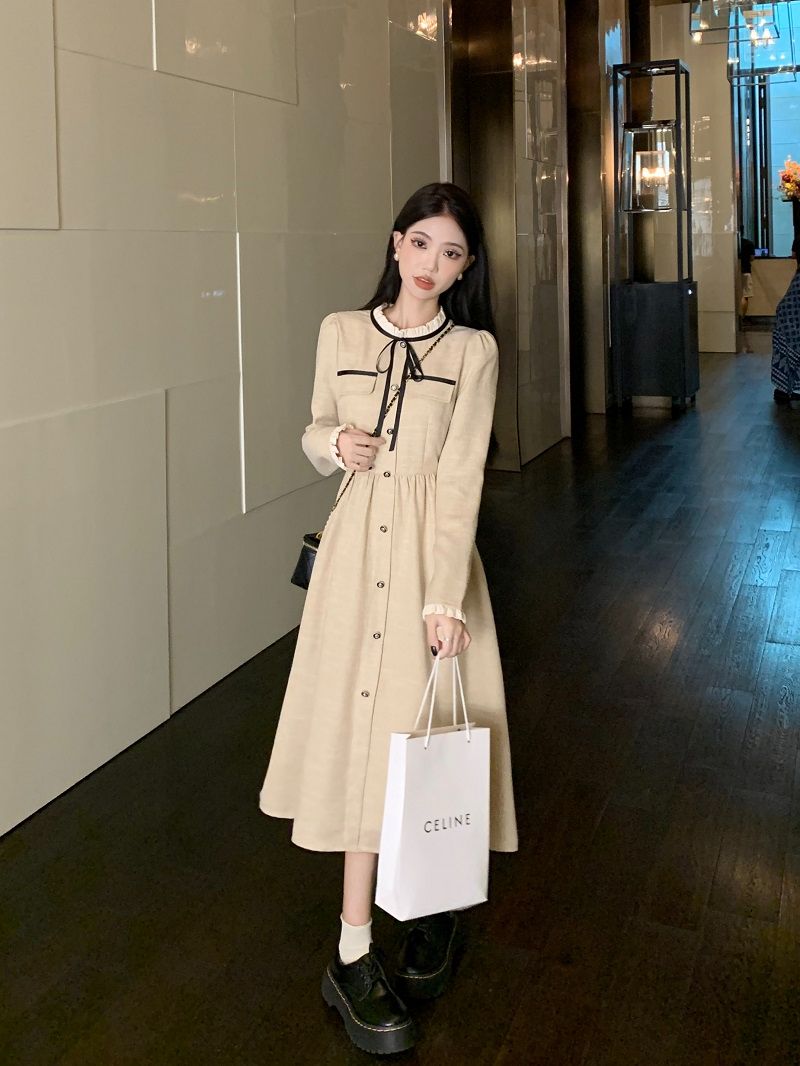 FA56493# 春装小香风连衣裙女新款名媛气质收腰显瘦中长款系带长袖裙子 服裝批發女裝批發服飾貨源