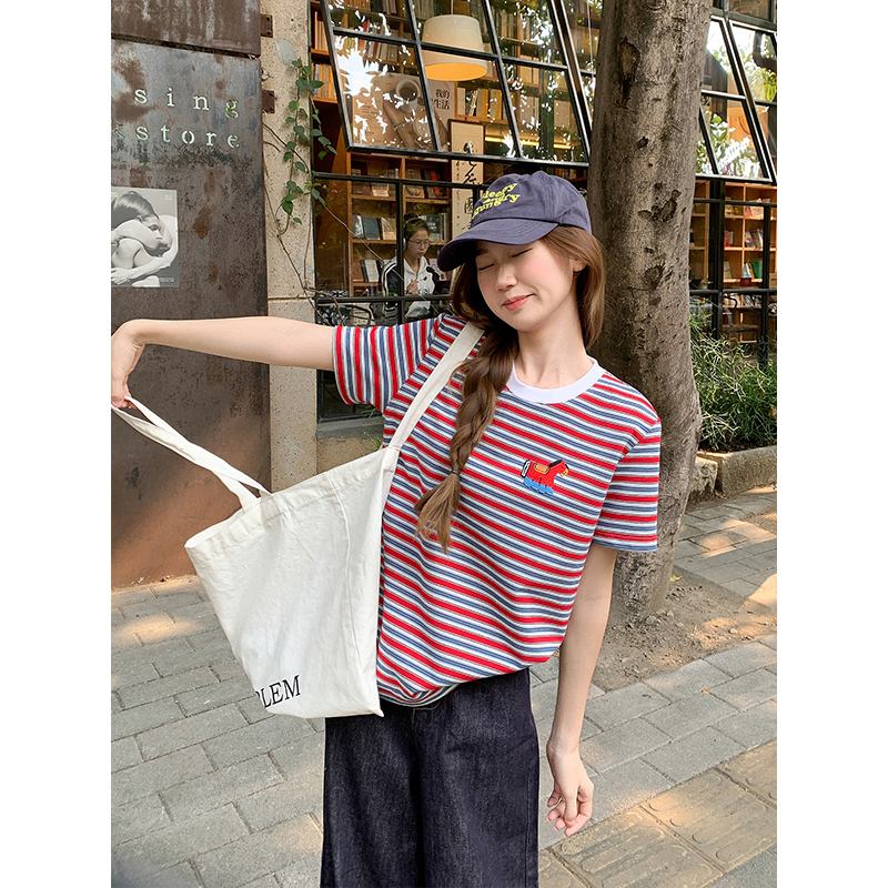 BY11195# 卡通刺绣条纹撞色圆领正肩短袖t恤女新款宽松休闲减龄小上衣 服裝批發女裝批發服飾貨源