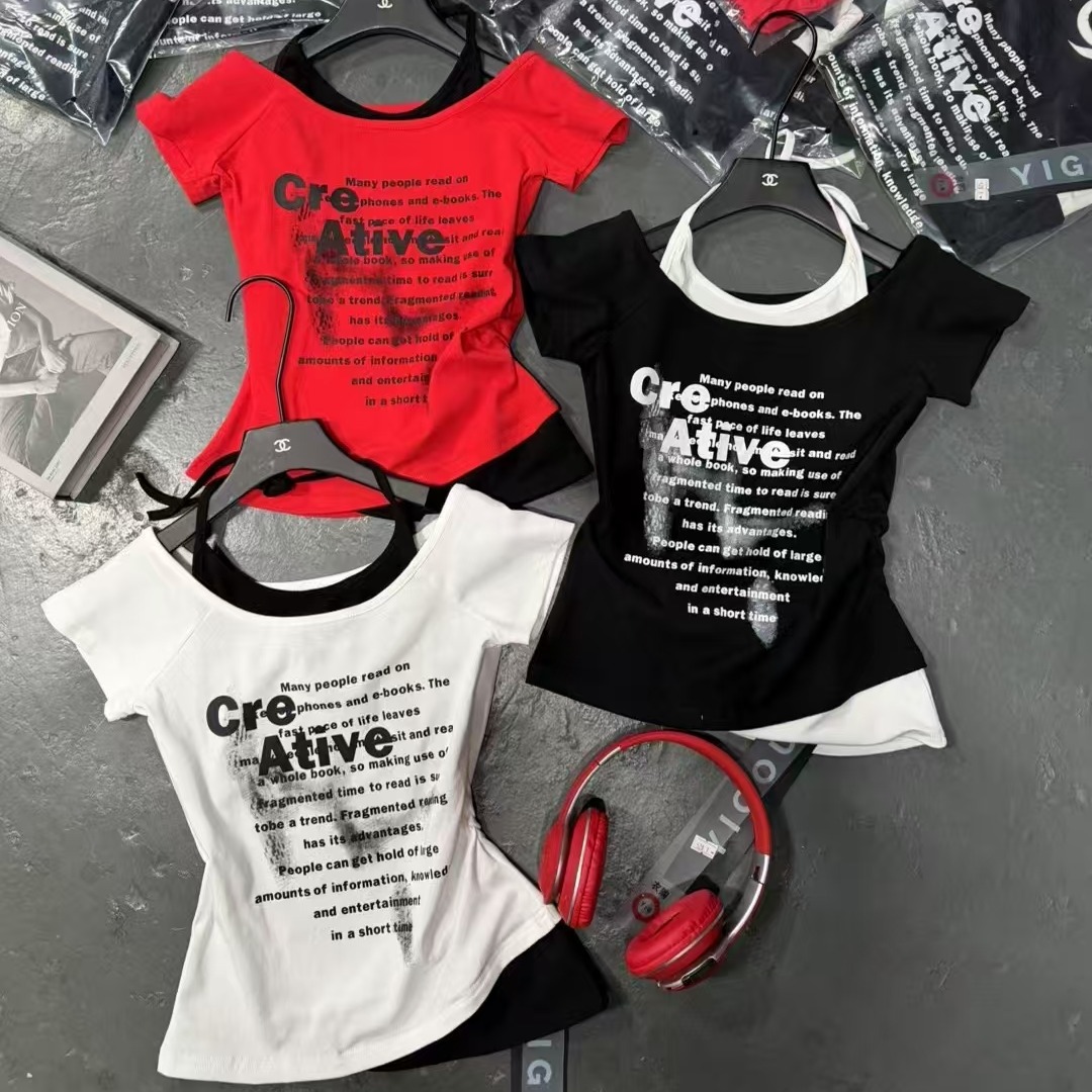 BY11290# 酷辣甜妹假两件撞色春夏新个性T恤ins潮牌韩日系ootd时尚街头 服裝批發女裝批發服飾貨源