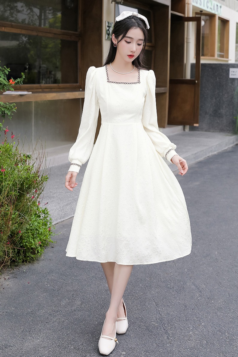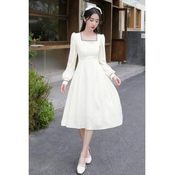 BY11360# 大码法式温柔风杏色方领花边连衣裙女高级感收腰显瘦气质长裙 服裝批發女裝批發服飾貨源