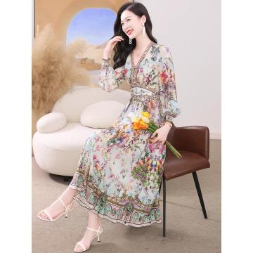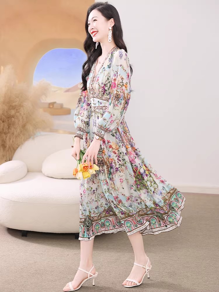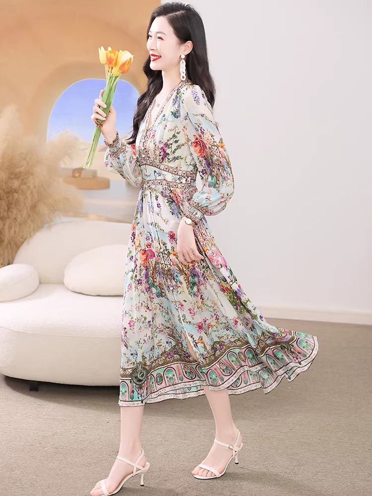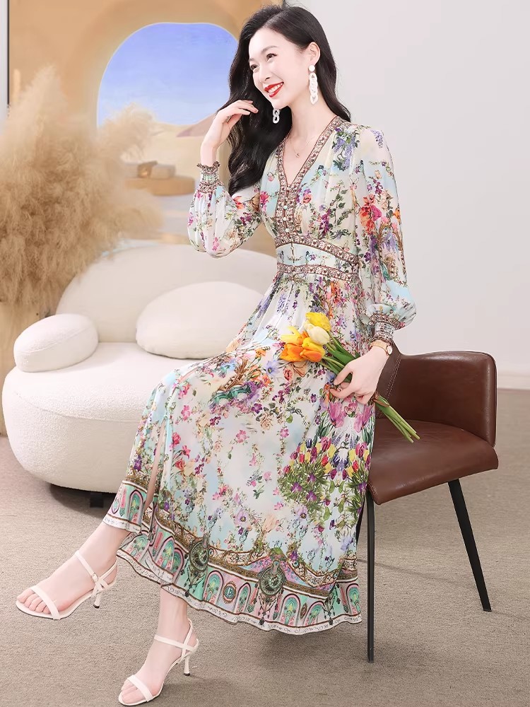 BY11364# 真丝连衣裙春新款海边度假风法式碎花裙轻奢复古桑蚕丝收腰裙 服裝批發女裝批發服飾貨源