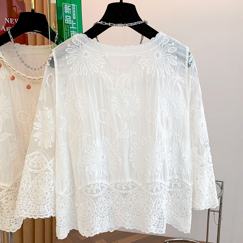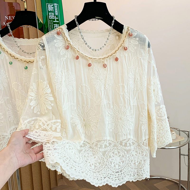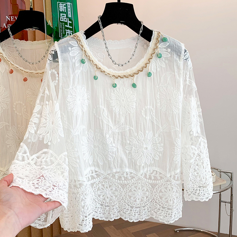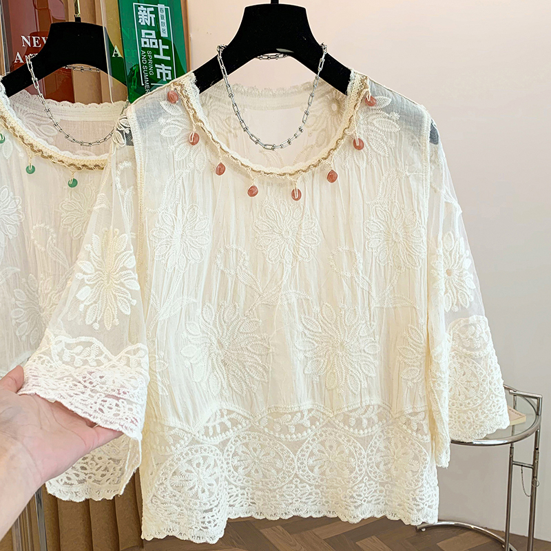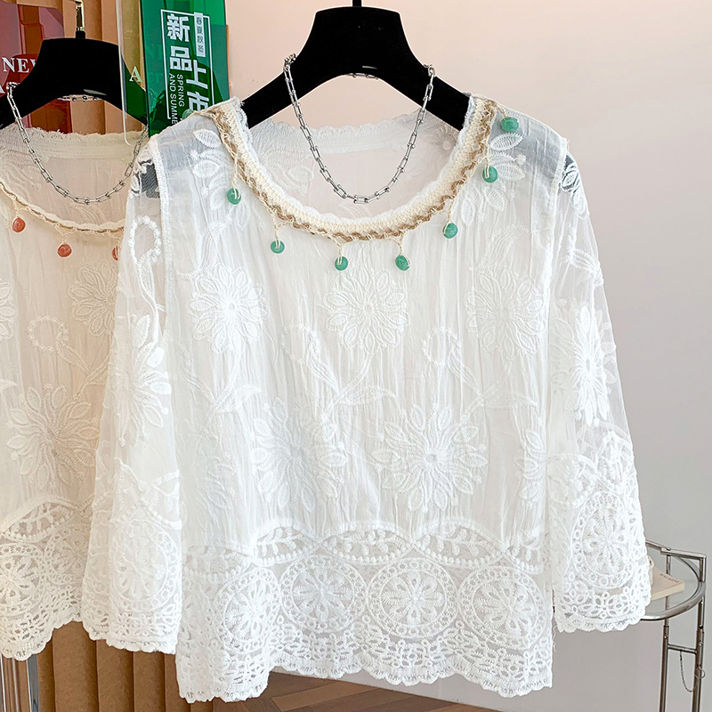 BY11440# 夏季新款波西米亚全棉提花刺绣手工钉珠百搭圆领套头小衫上衣 服裝批發女裝批發服飾貨源