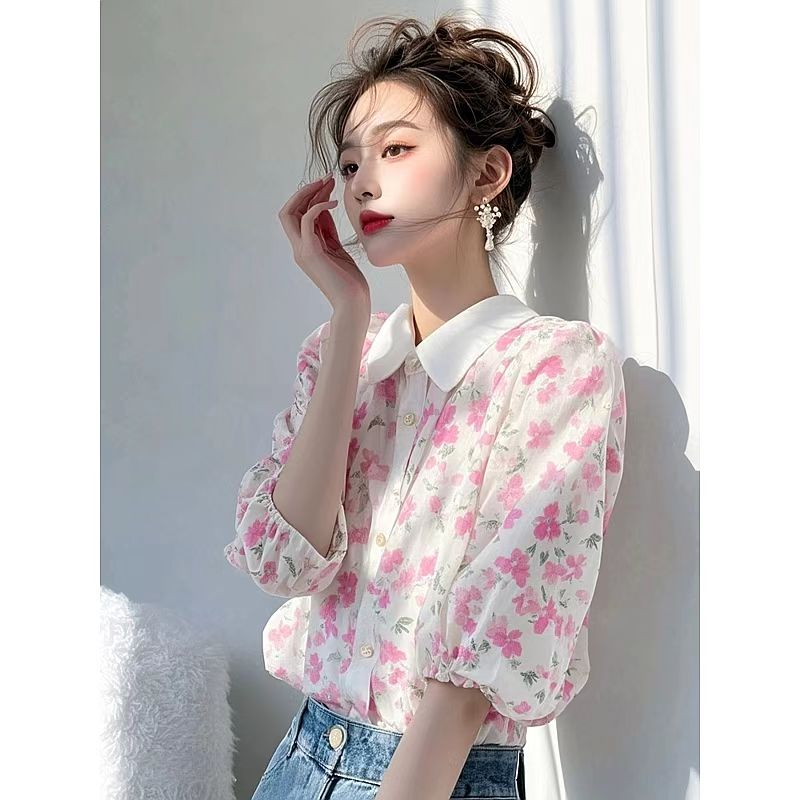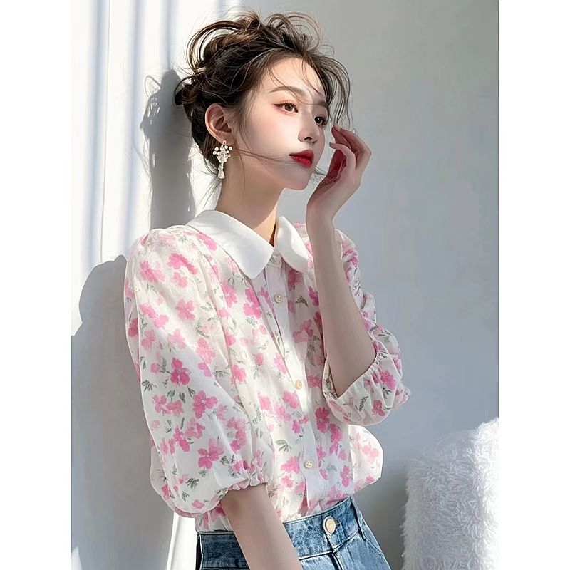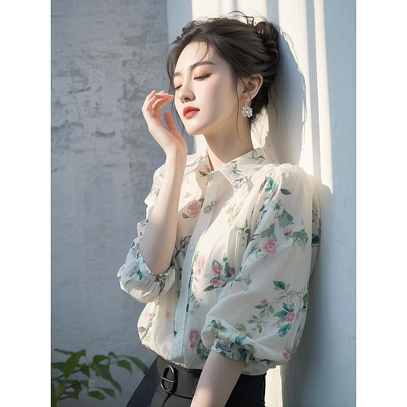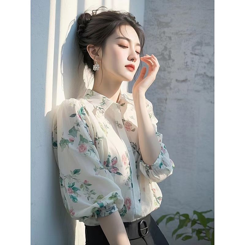 BY11447# 春装新款独特漂亮小衫法式高级感超好看气质白色碎花雪纺衬衫 服裝批發女裝批發服飾貨源