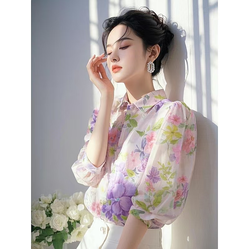 BY11448# 法式高级感超好看独特漂亮紫色碎花雪纺衬衫女开春新款上衣 服裝批發女裝批發服飾貨源