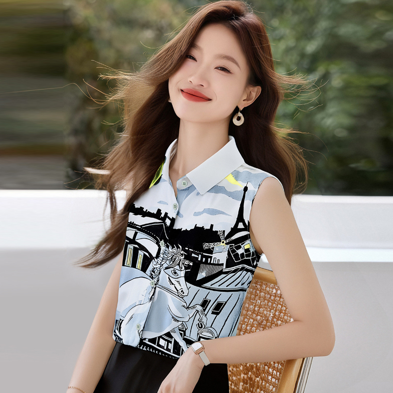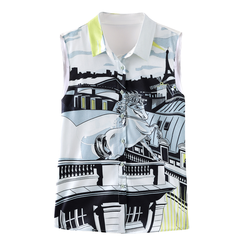 BY11462# 春新款欧货缎面背心百搭撞色印花衬衫女设计感高端上衣 服裝批發女裝批發服飾貨源