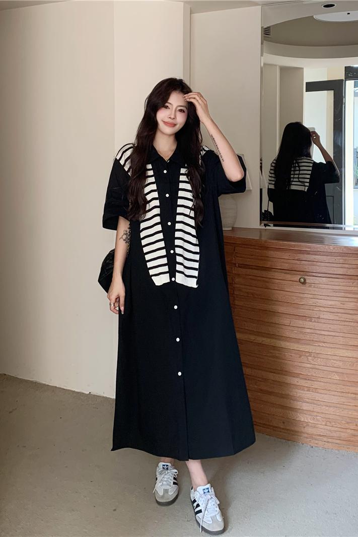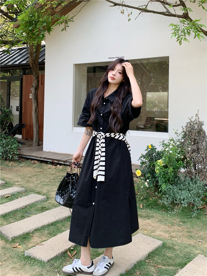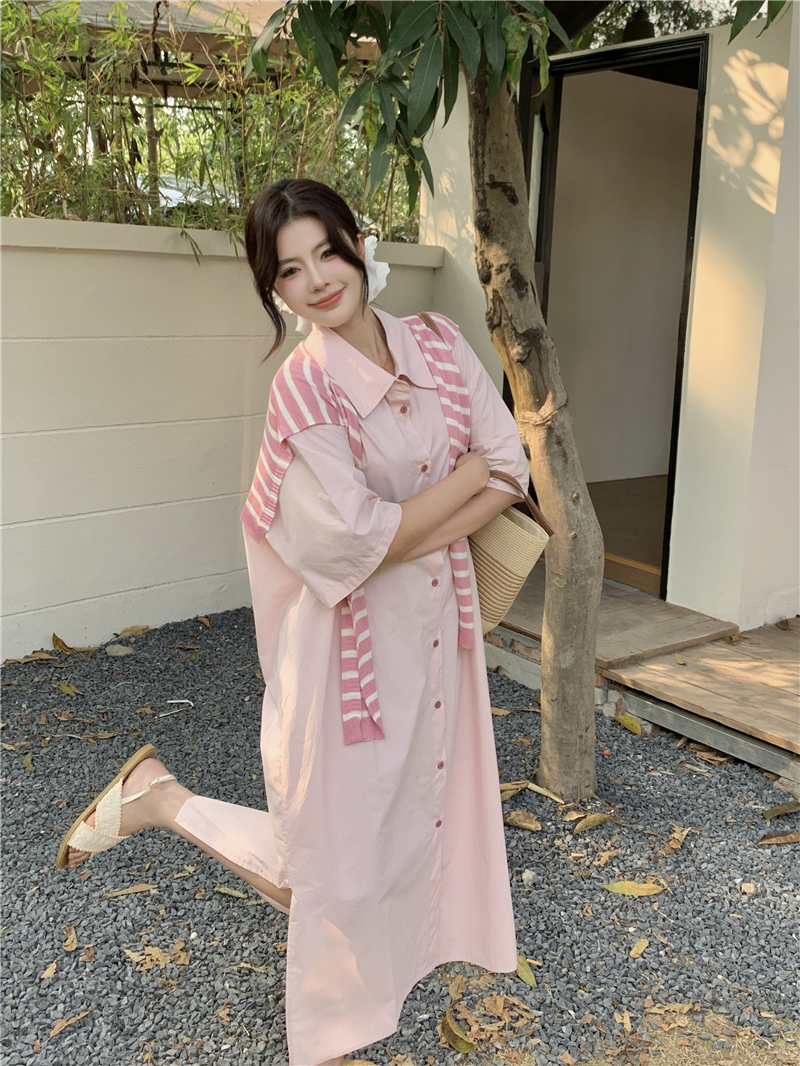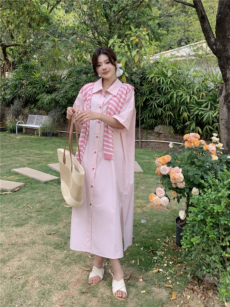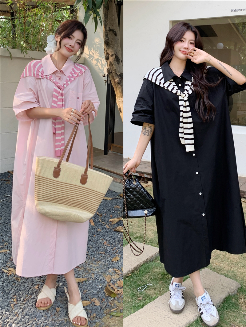 BY11482# 大码女装慵懒高级感休闲宽松遮肉长款衬衫连衣裙配条纹披肩 服裝批發女裝批發服飾貨源