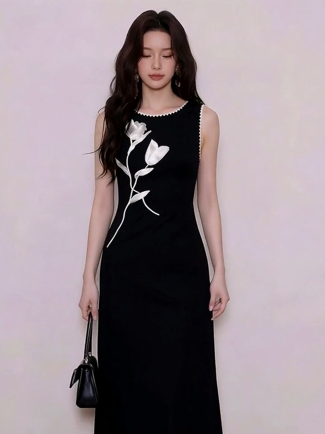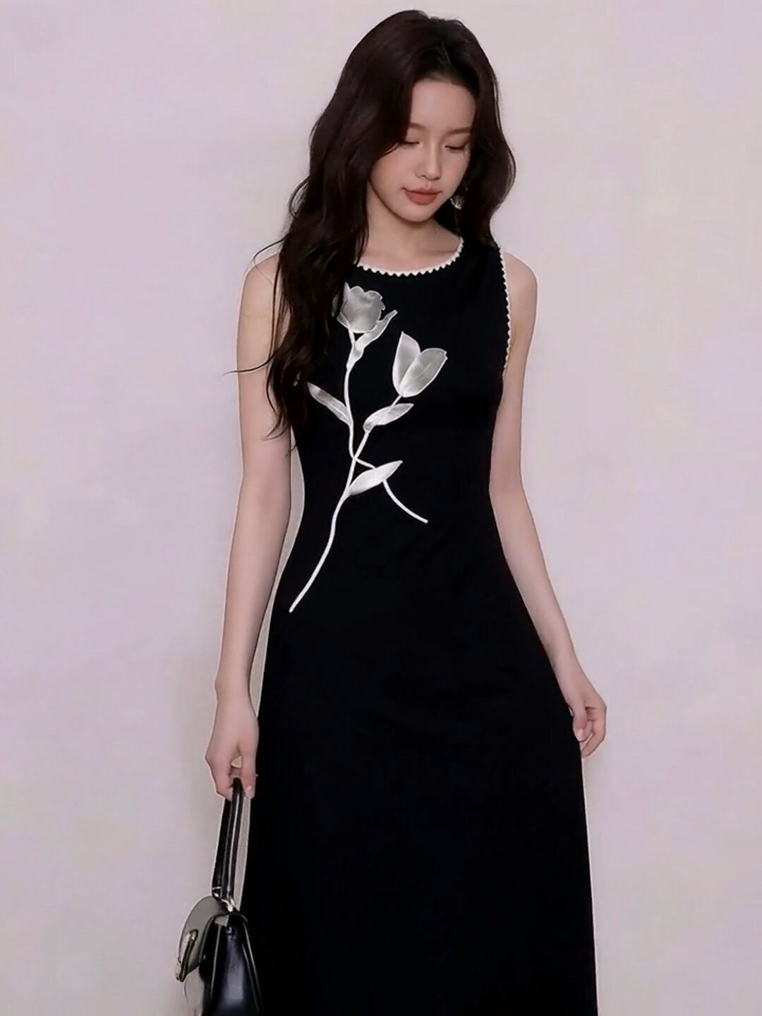 法式黑色印花无袖背心连衣裙子女春夏新款高级感收腰修身长裙 服裝批發女裝批發服飾貨源