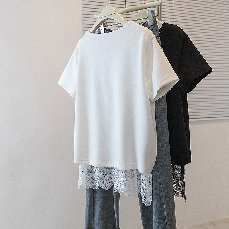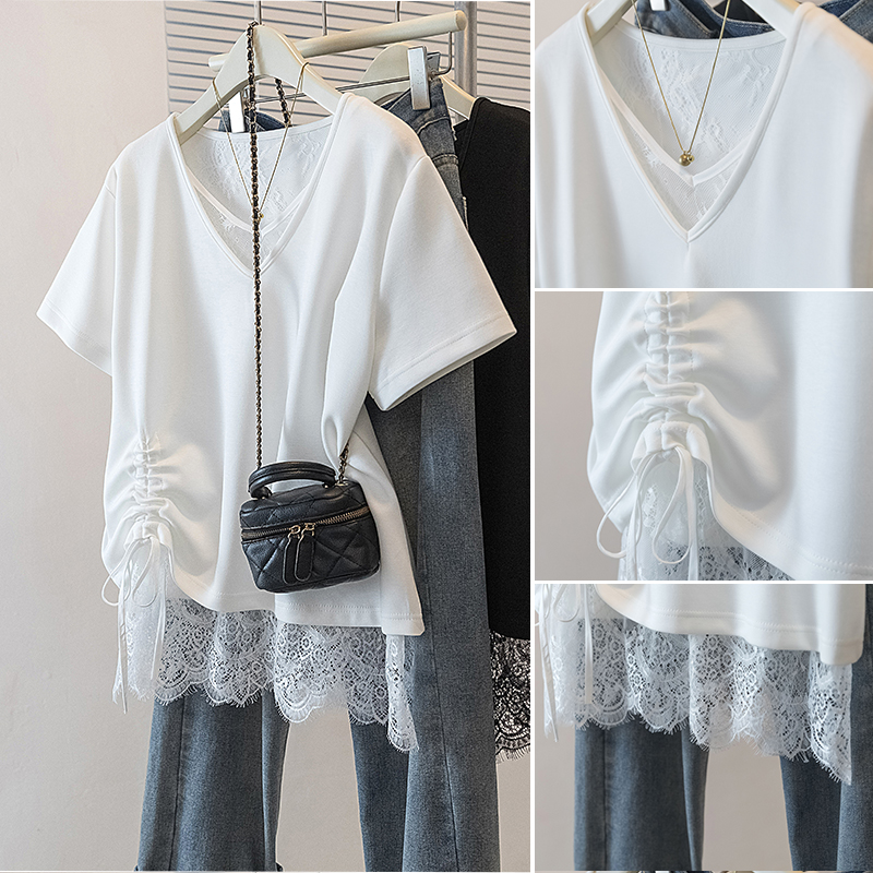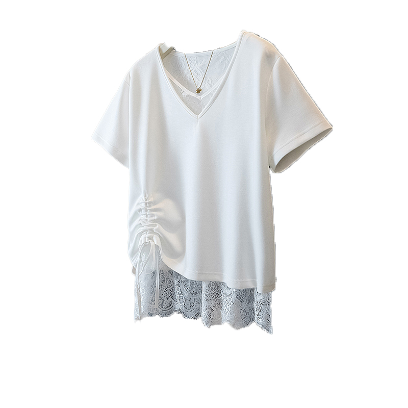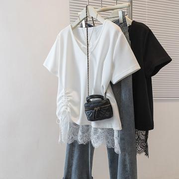 大码女装韩版新款高级潮流单抽绳设计蕾丝拼接通勤宽修身上衣 服裝批發女裝批發服飾貨源
