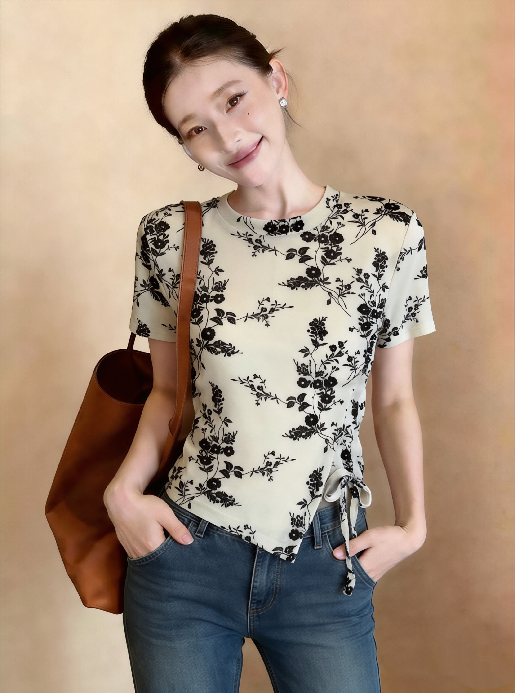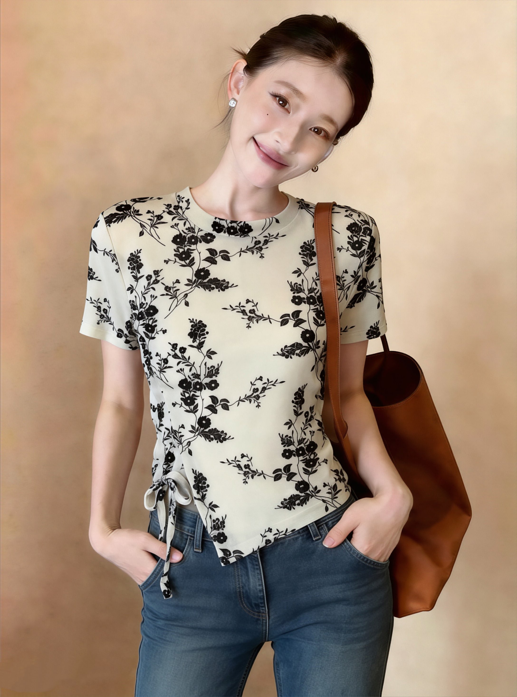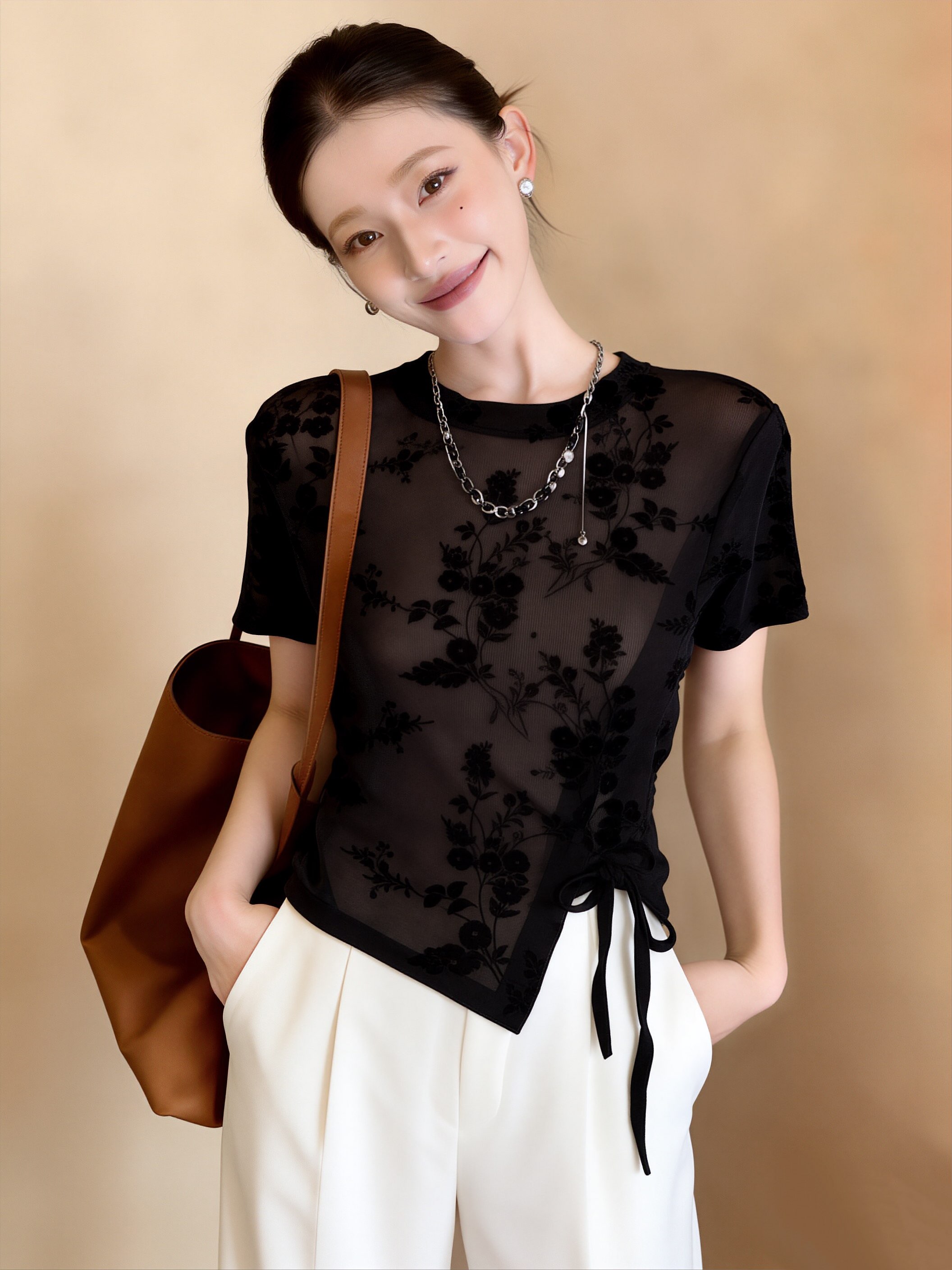 夏女新款新时尚小衫网纱植绒印花抽绳短袖衬衫修身正肩 服裝批發女裝批發服飾貨源