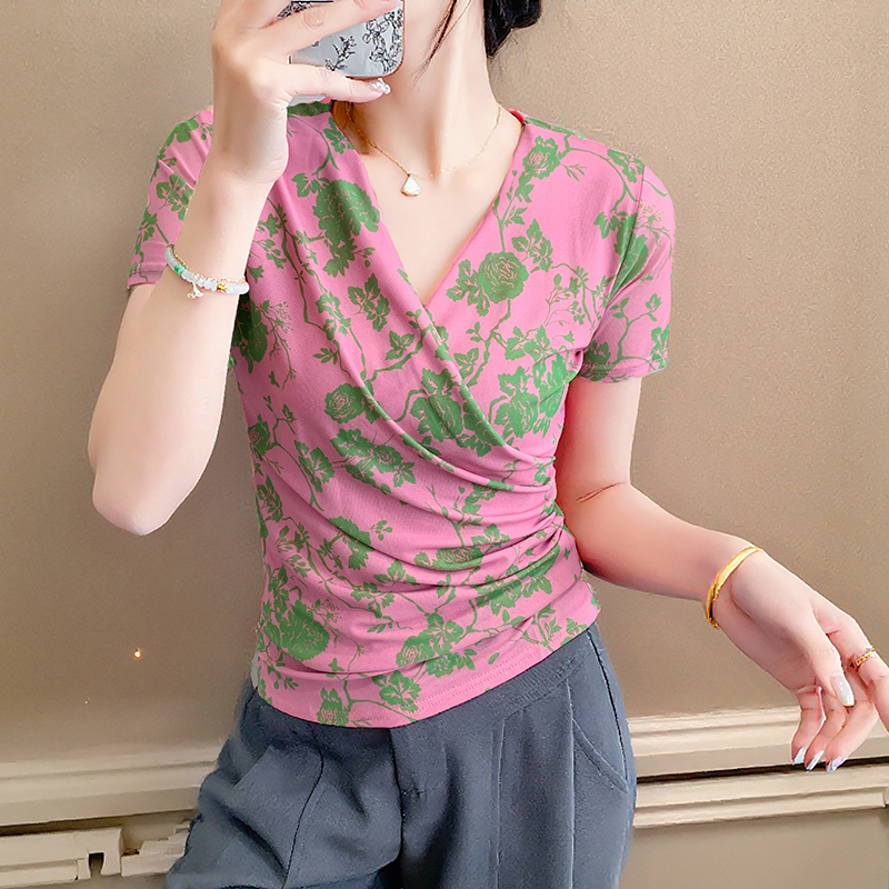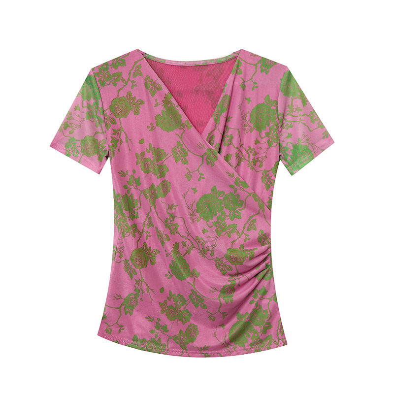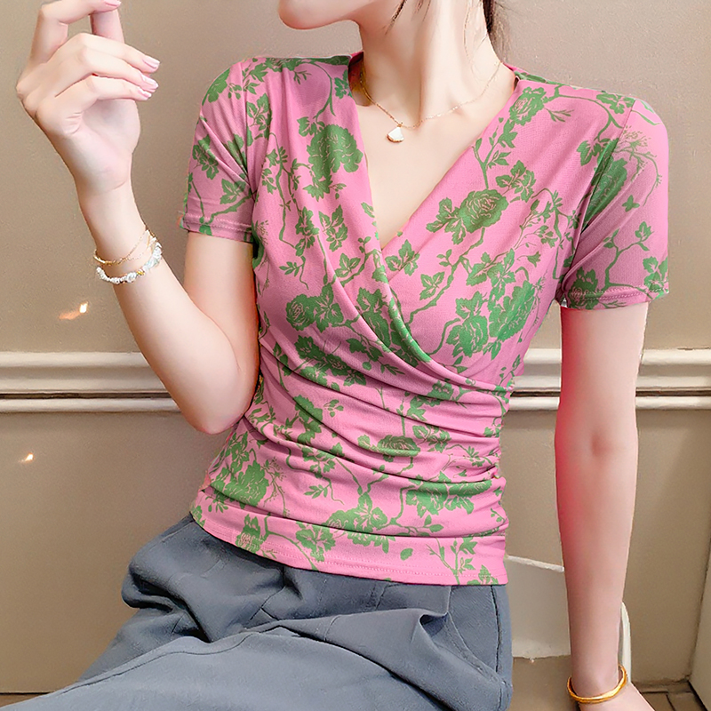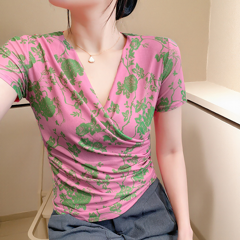 夏季皱褶交叉V领时尚短袖网纱印花时尚修身显瘦打底衫潮 服裝批發女裝批發服飾貨源