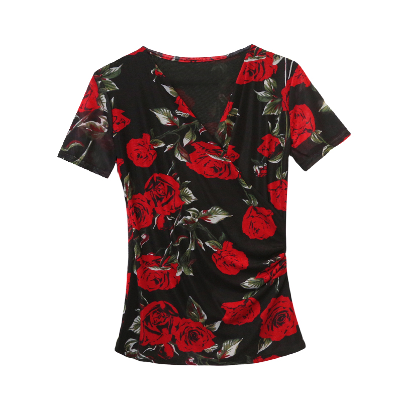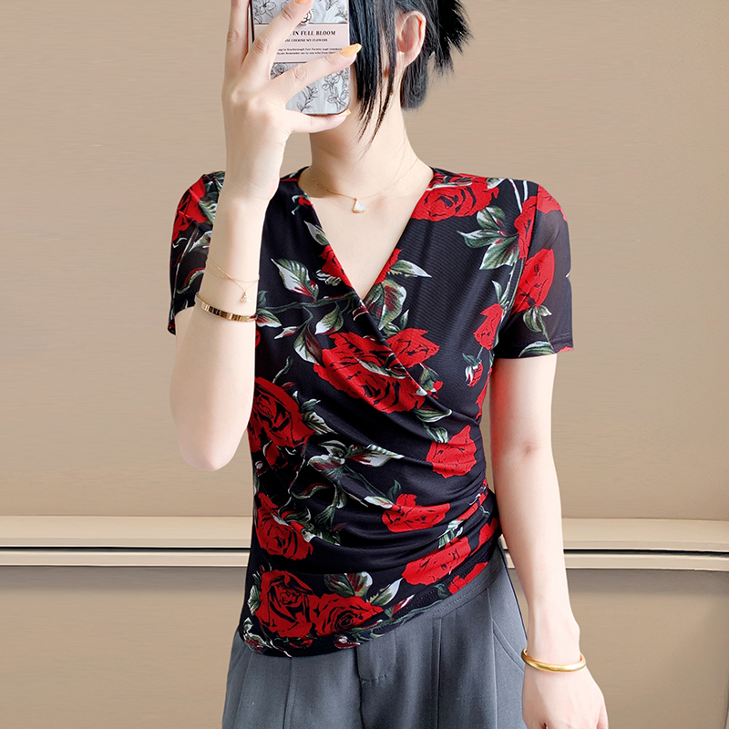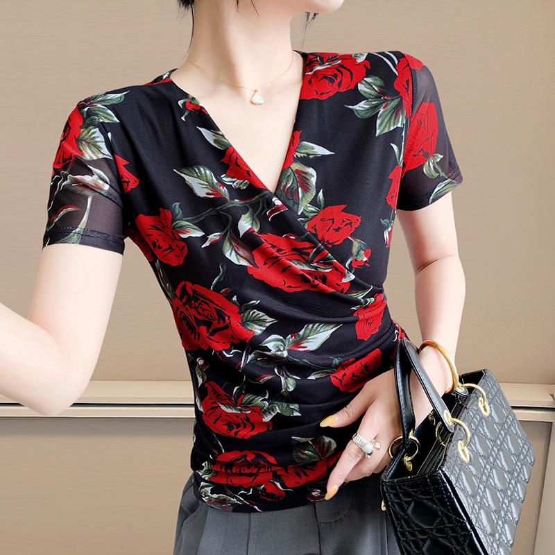 夏季皱褶交叉V领时尚短袖网纱印花时尚修身显瘦打底衫潮 服裝批發女裝批發服飾貨源