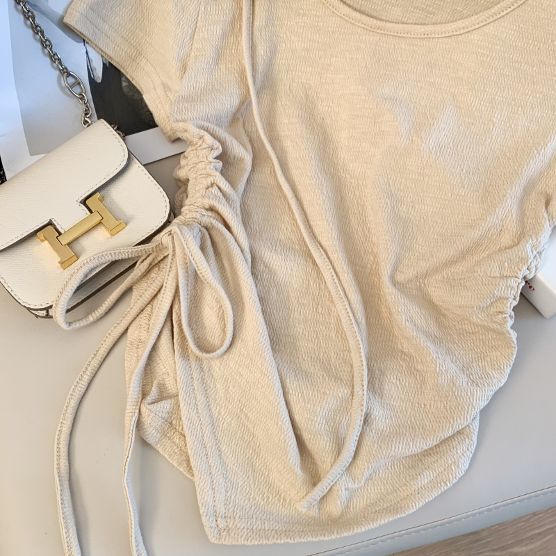 BY11585# 纯欲法式设计感短款T恤女立体玫瑰花抽绳收腰短袖上衣 服裝批發女裝批發服飾貨源