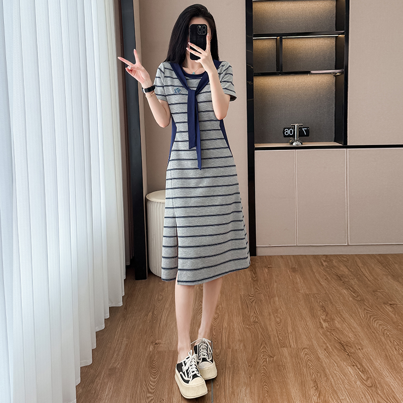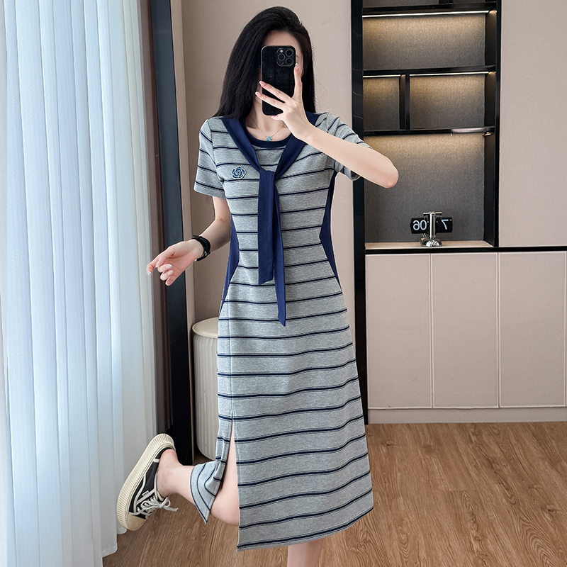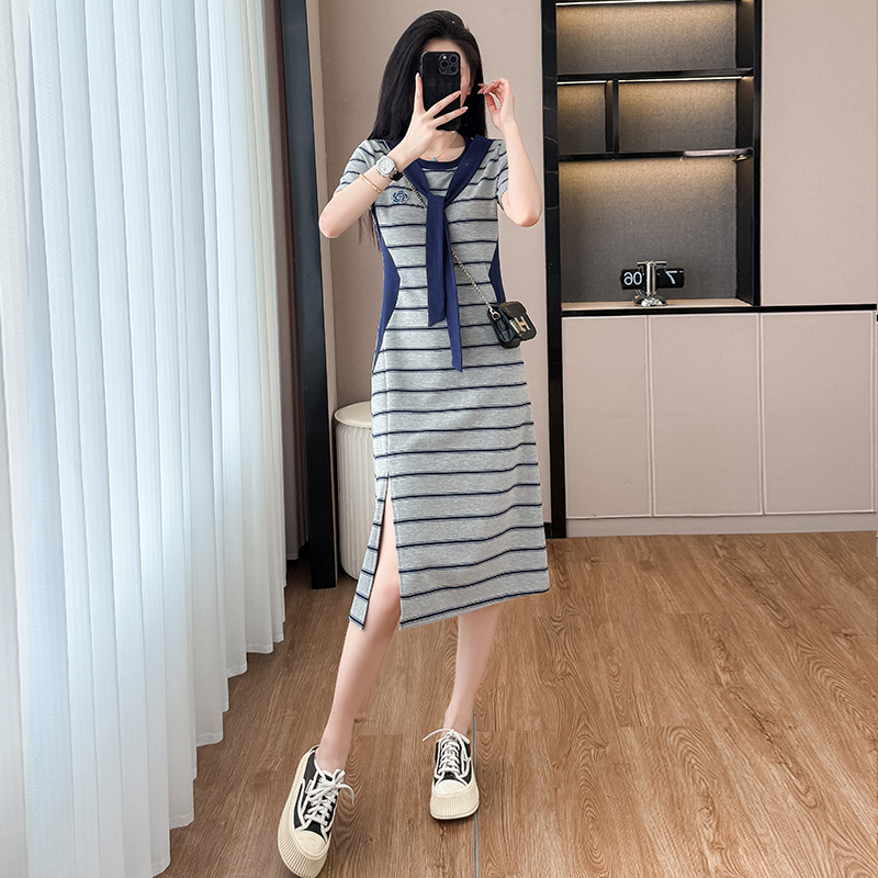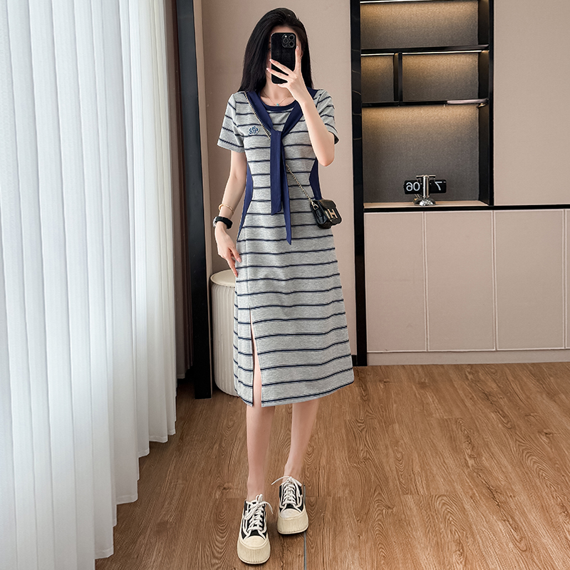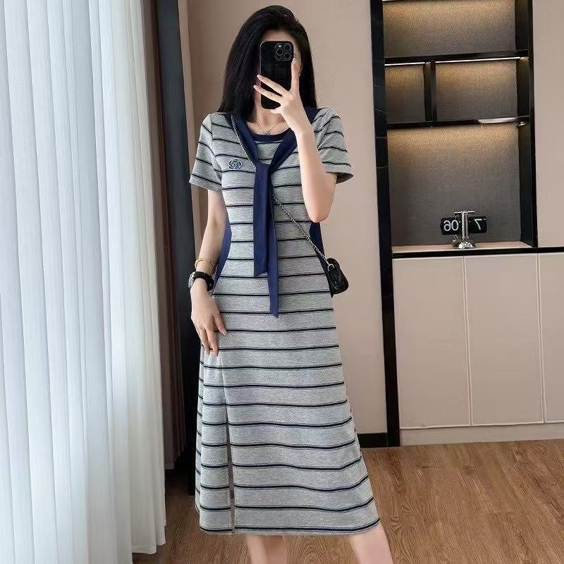 条纹连衣裙开叉设计感肩带山茶花遮肉显瘦时尚休闲中长款大码 服裝批發女裝批發服飾貨源