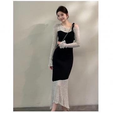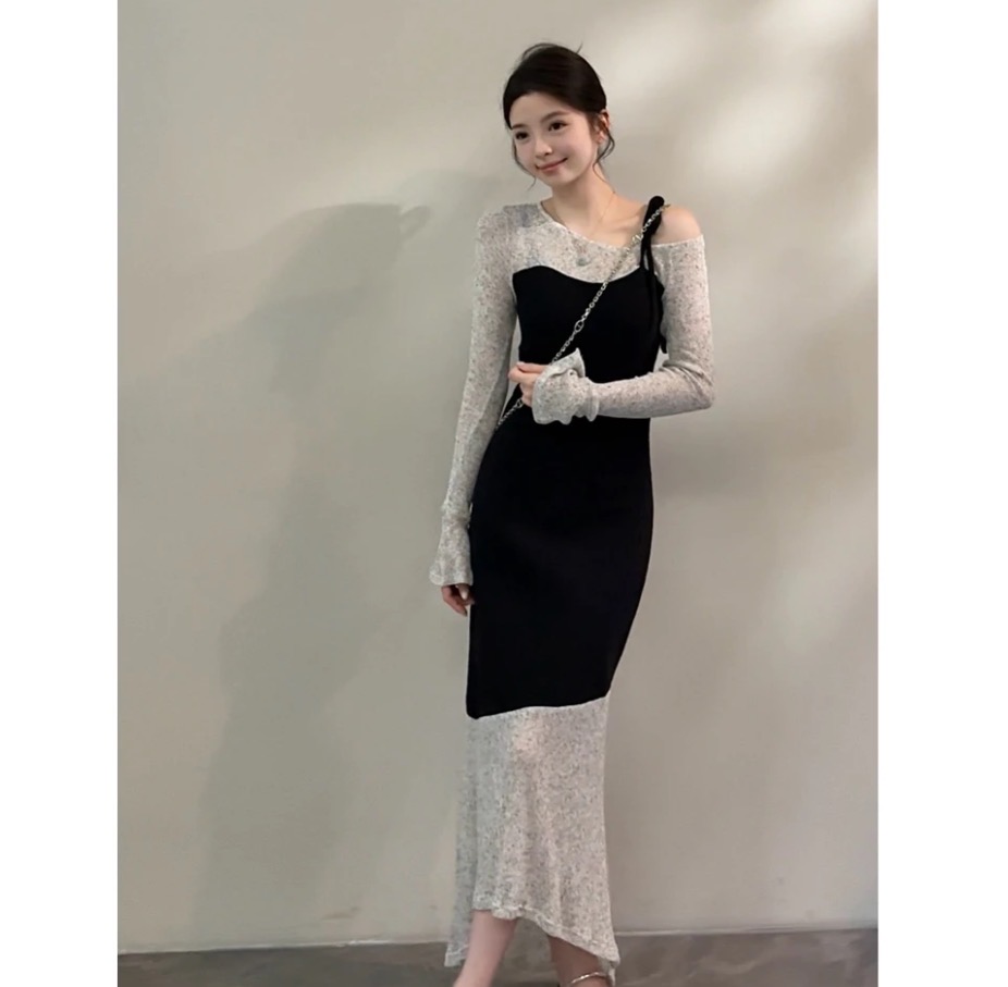BY11962# 颂宋春季新款拼色不规则假两件喇叭袖针织中长连衣裙 服裝批發女裝批發服飾貨源