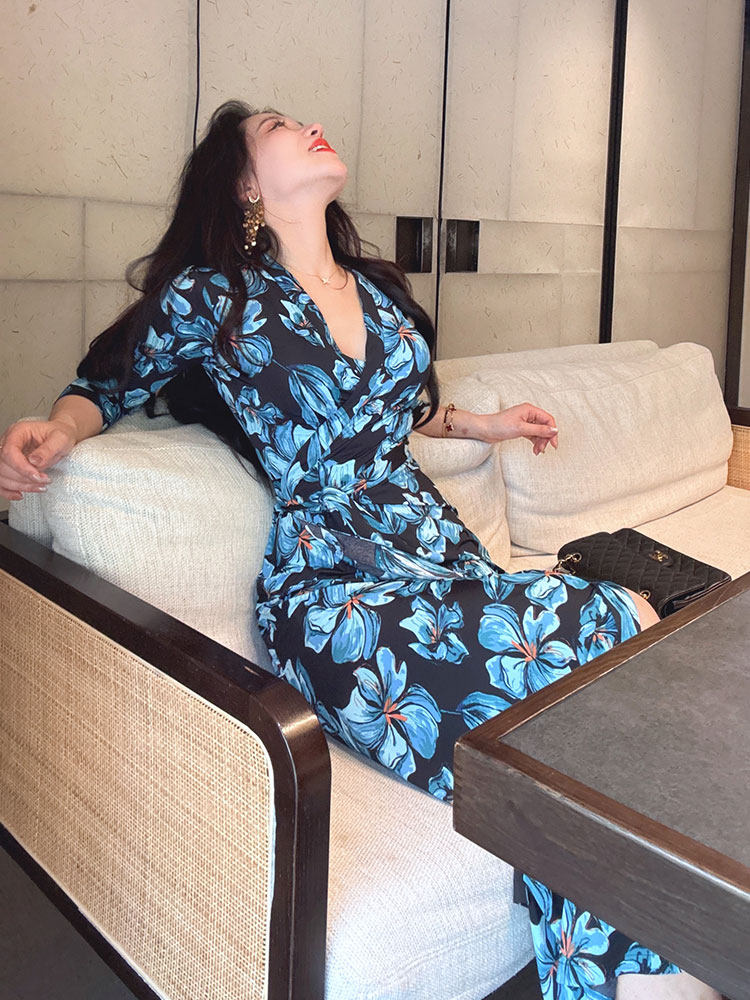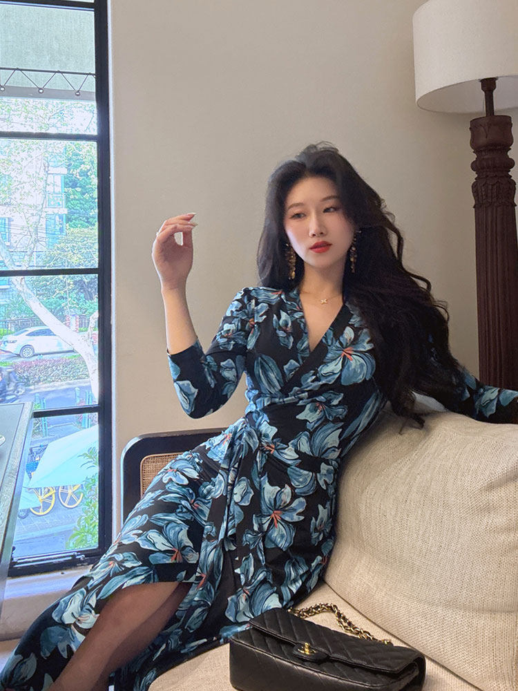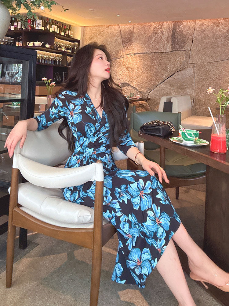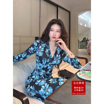 BY12424# 幽蓝私语春夏季裹身裙法式水墨花收腰修身显瘦连衣裙子女 服裝批發女裝批發服飾貨源