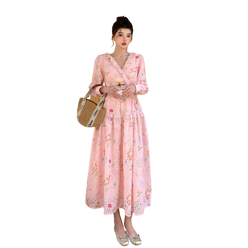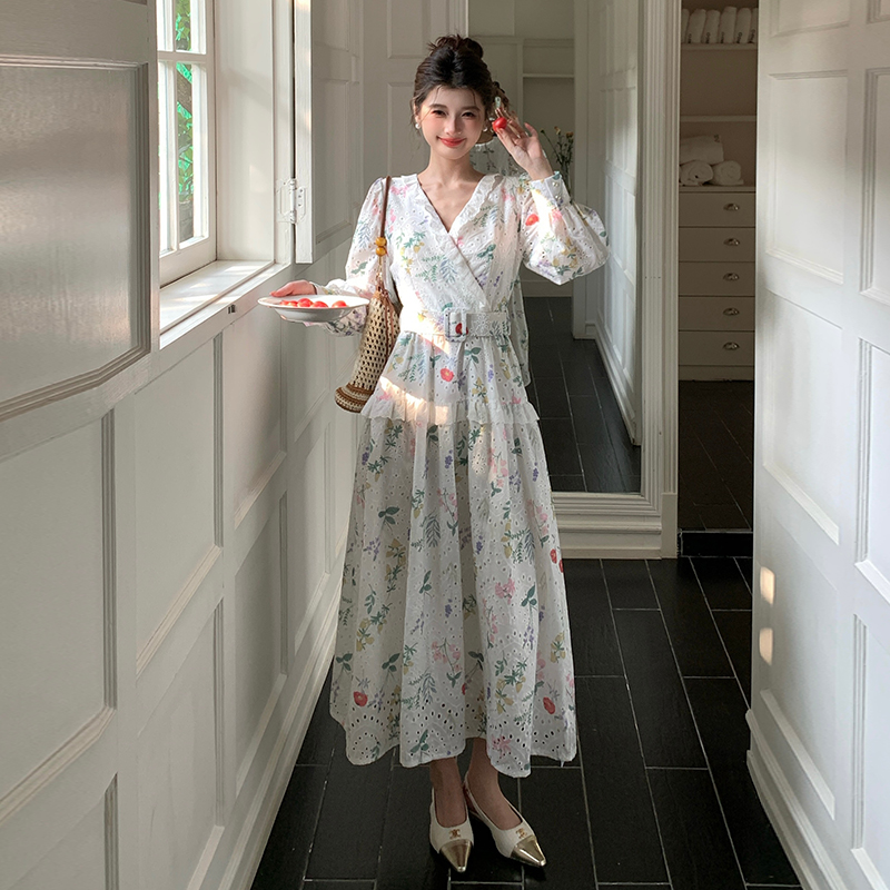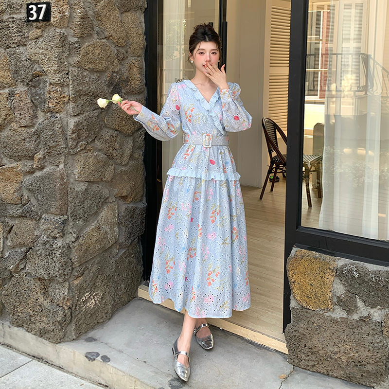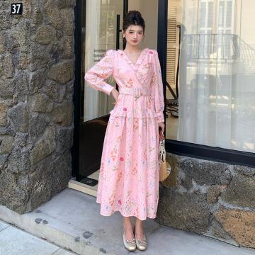 BY12470# 品质新款法式茶歇V领碎花连衣裙配腰带 服裝批發女裝批發服飾貨源