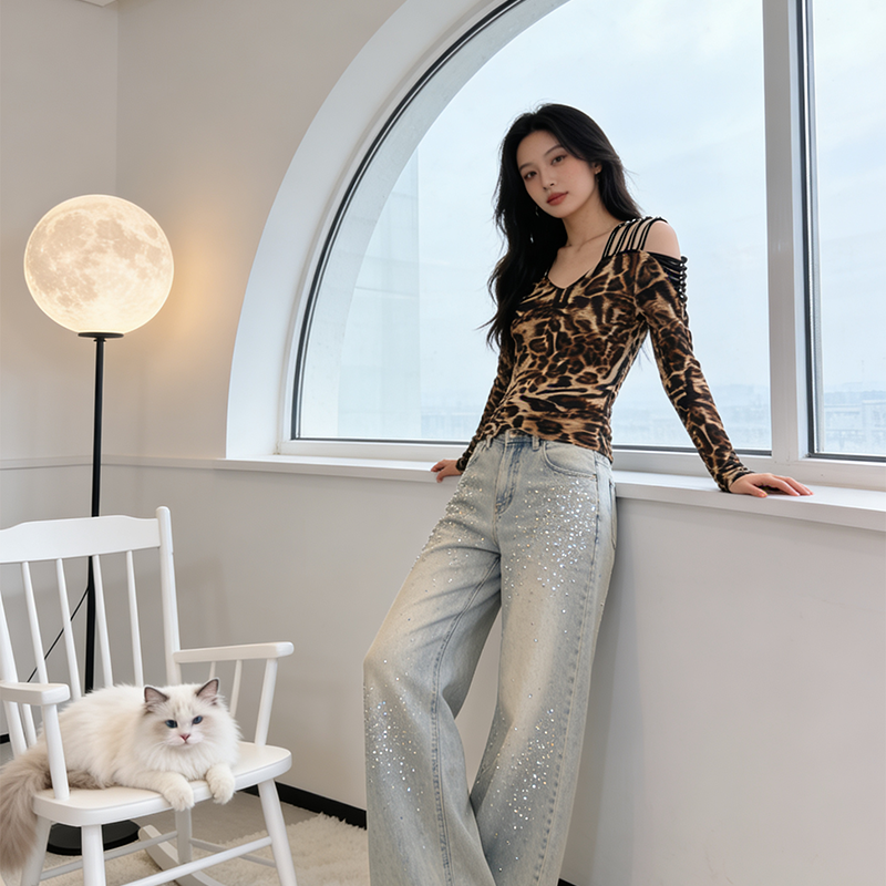 BY12474# 新款豹纹印花网纱设计花边镂空镶钻修身显瘦时尚V领性感美背小衫 服裝批發女裝批發服飾貨源