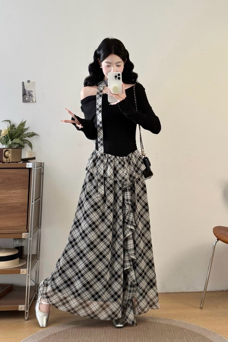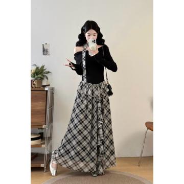 BY12600# 大码女装胖mm春夏法式一字领针织拼接假两件格子荷叶边连衣裙 服裝批發女裝批發服飾貨源
