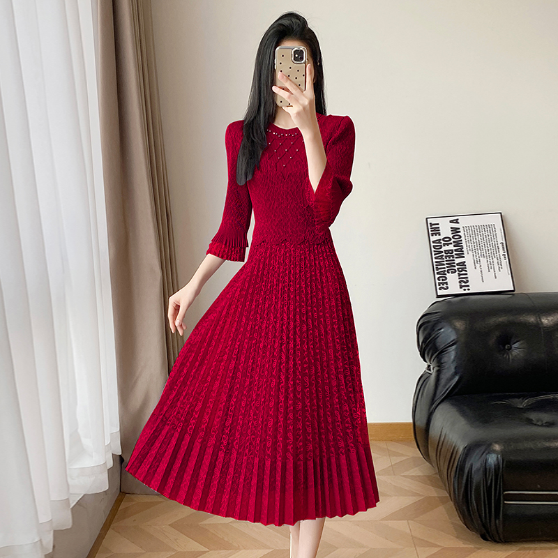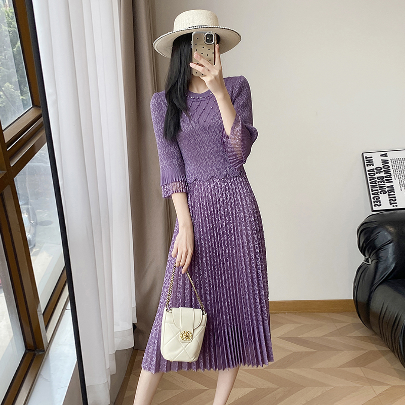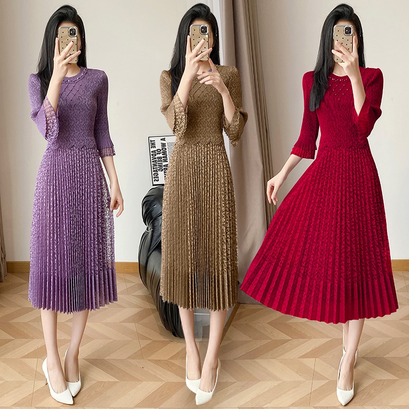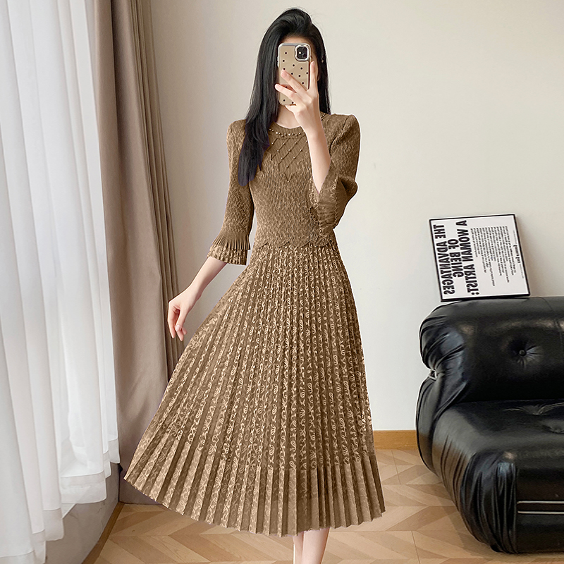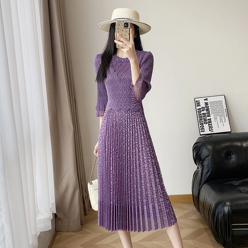 BY12610# 欧洲站春新款时尚褶皱蕾丝拼接修身显瘦连衣裙中长款百褶裙 服裝批發女裝批發服飾貨源