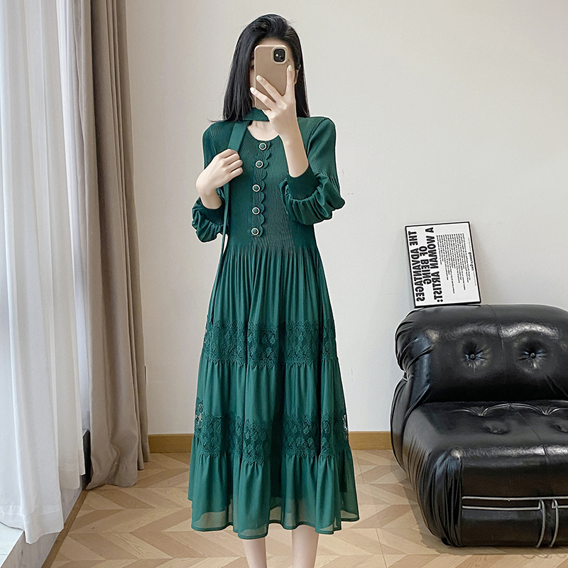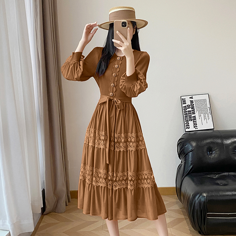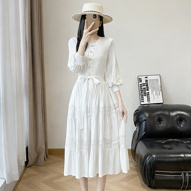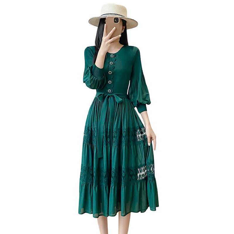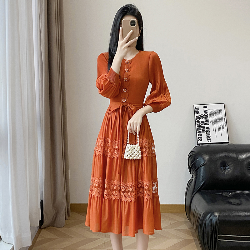 BY12615# 韩版通勤黄色蕾丝镂空刺绣连衣裙女长袖高腰A字裙大摆气质显瘦 服裝批發女裝批發服飾貨源
