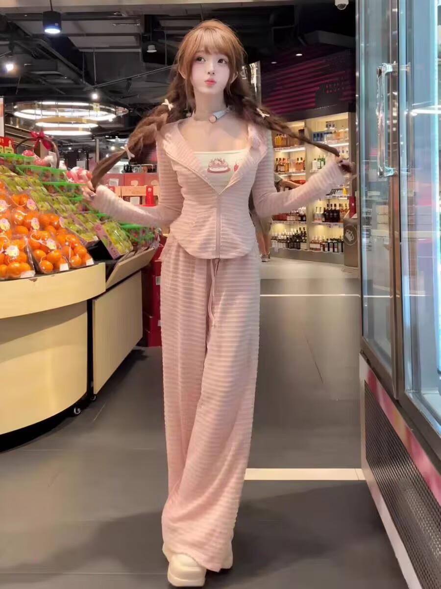 BY12783# 春季新款粉色条纹减龄休闲运动穿搭一整套女小个子两件套装 服裝批發女裝批發服飾貨源