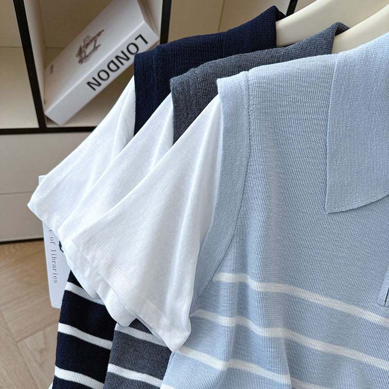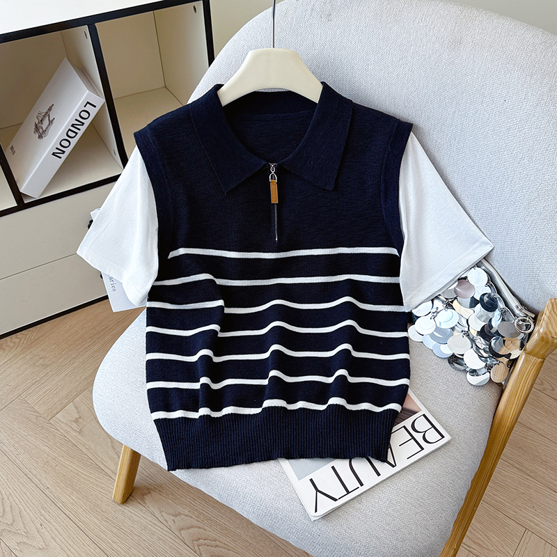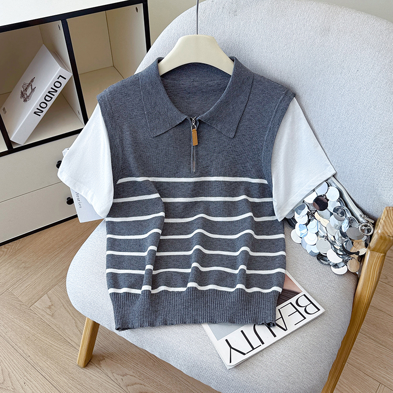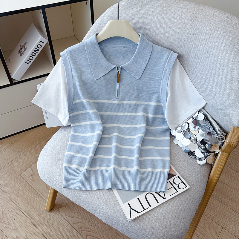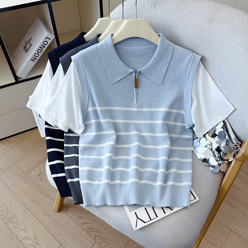 BY12787# 夏季新款假两件休闲圆领前拉链提花T恤天丝麻针织衫上衣女 服裝批發女裝批發服飾貨源