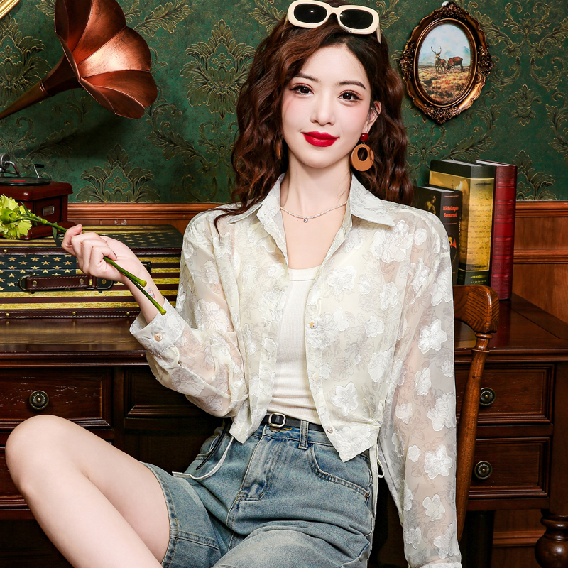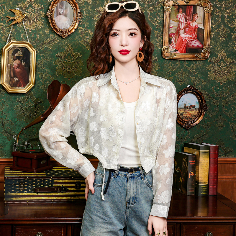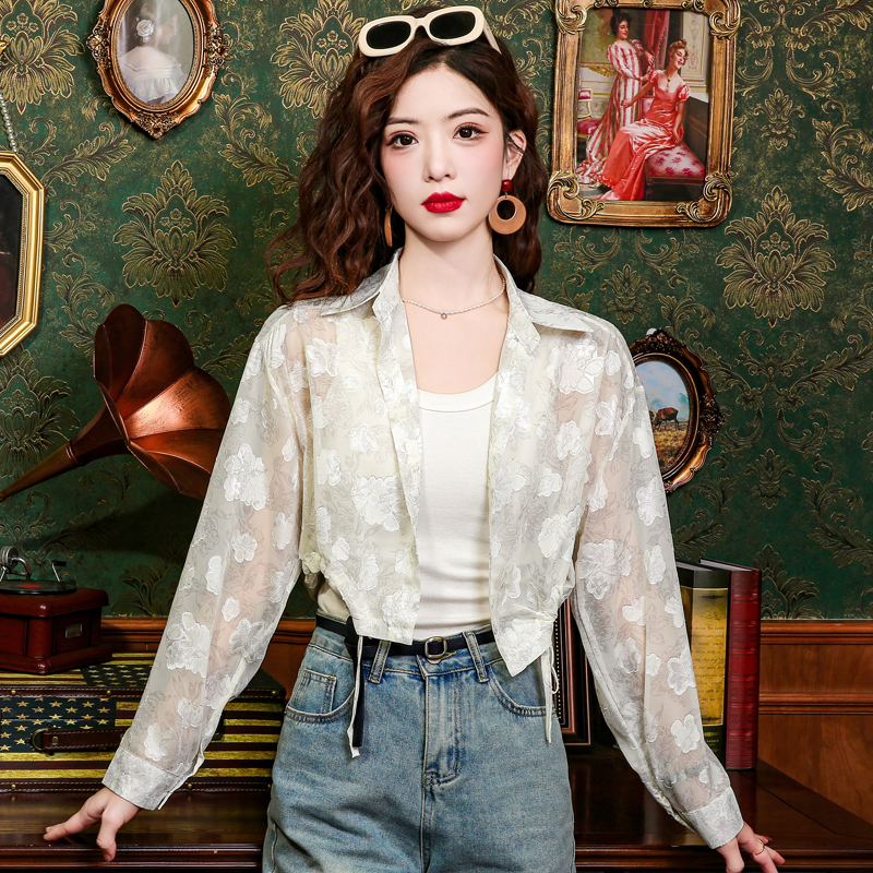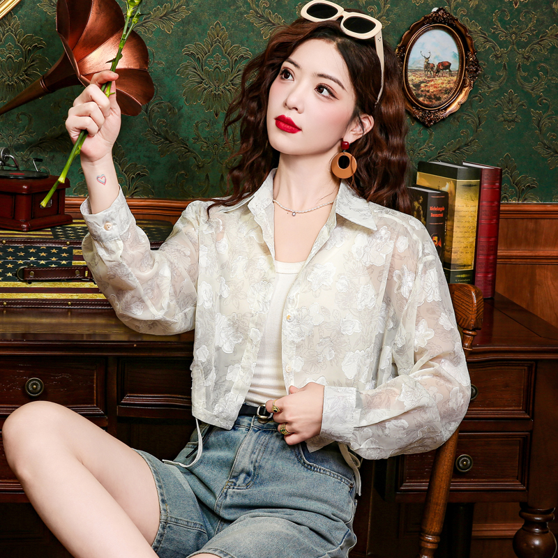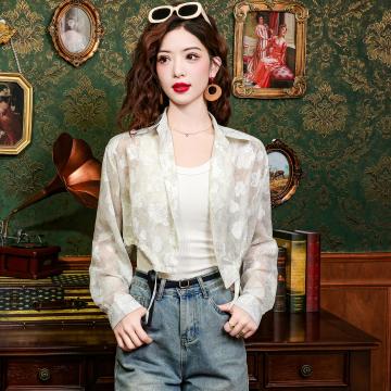 BY12814# 已出货碎花雪纺衬衫防晒衣女装夏季长袖薄款开衫上衣短款外套 服裝批發女裝批發服飾貨源