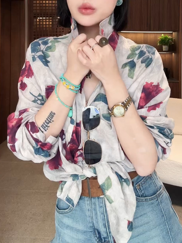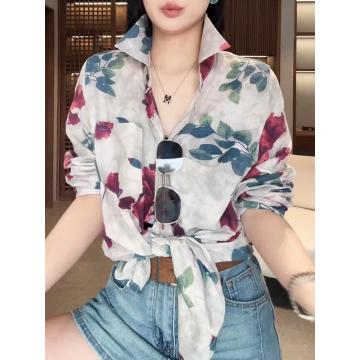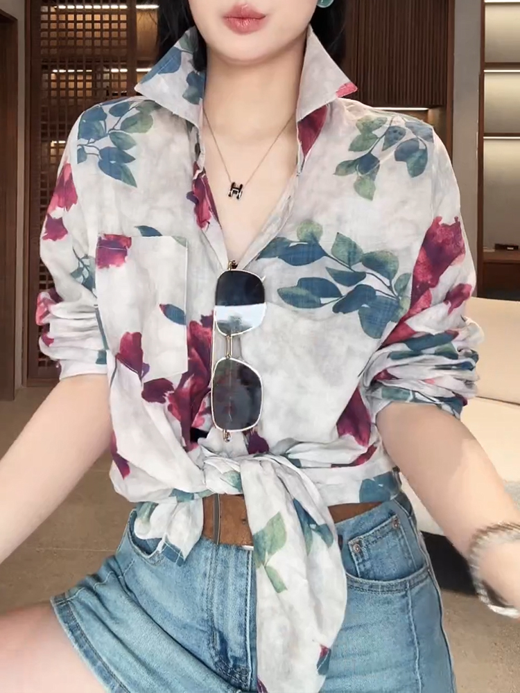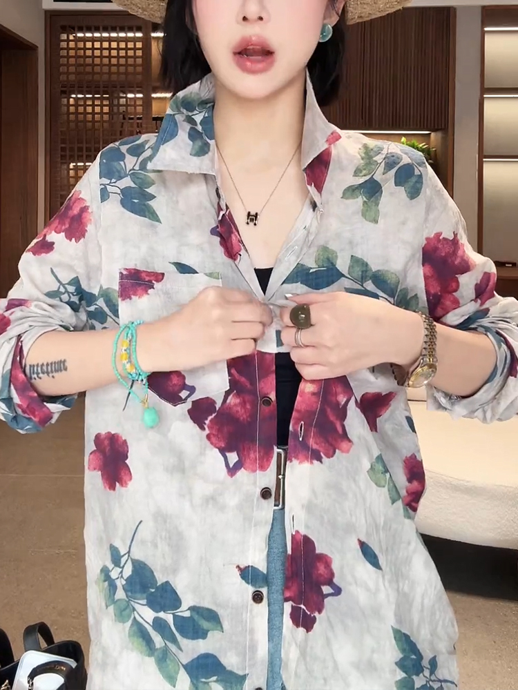 BY12848# 韩版文艺风长袖衬衫女春新款独特印花上衣休闲百搭薄款防晒衣 服裝批發女裝批發服飾貨源