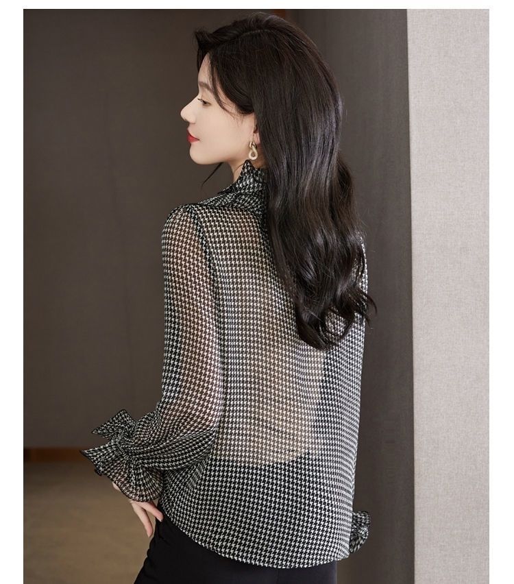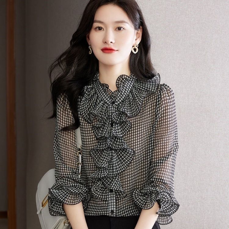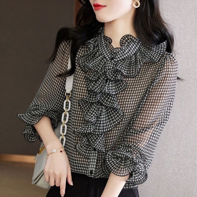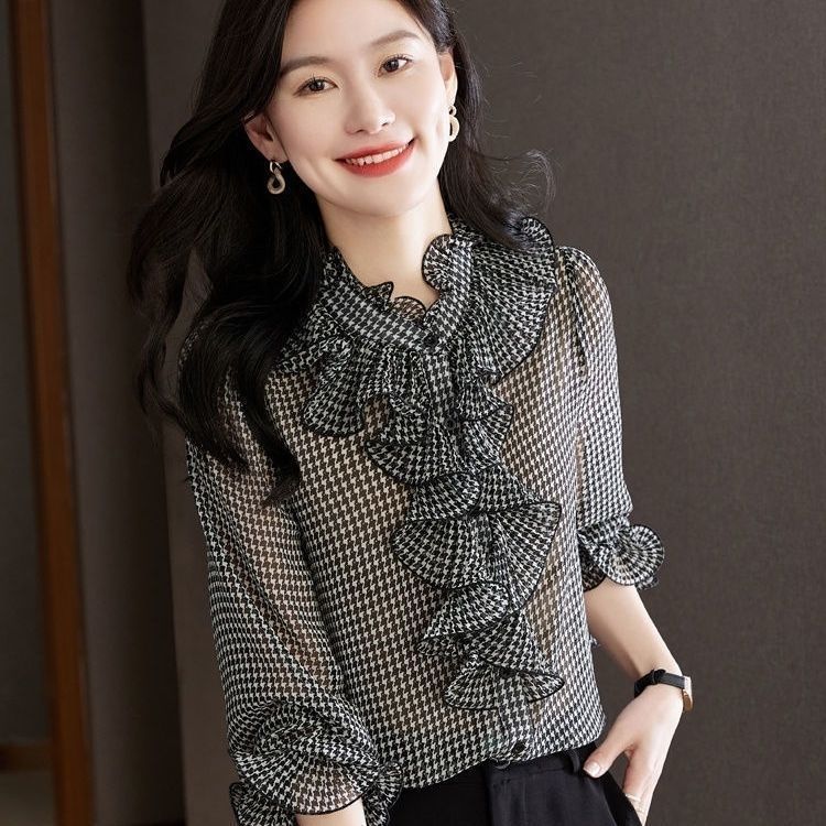 BY12861# 千鸟格雪纺衬衫时尚大方休闲气质百搭韩版荷叶边秋新款长袖衬衫 服裝批發女裝批發服飾貨源