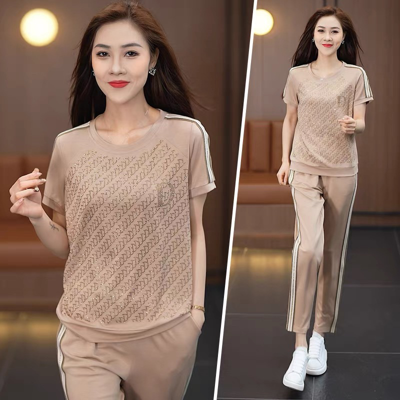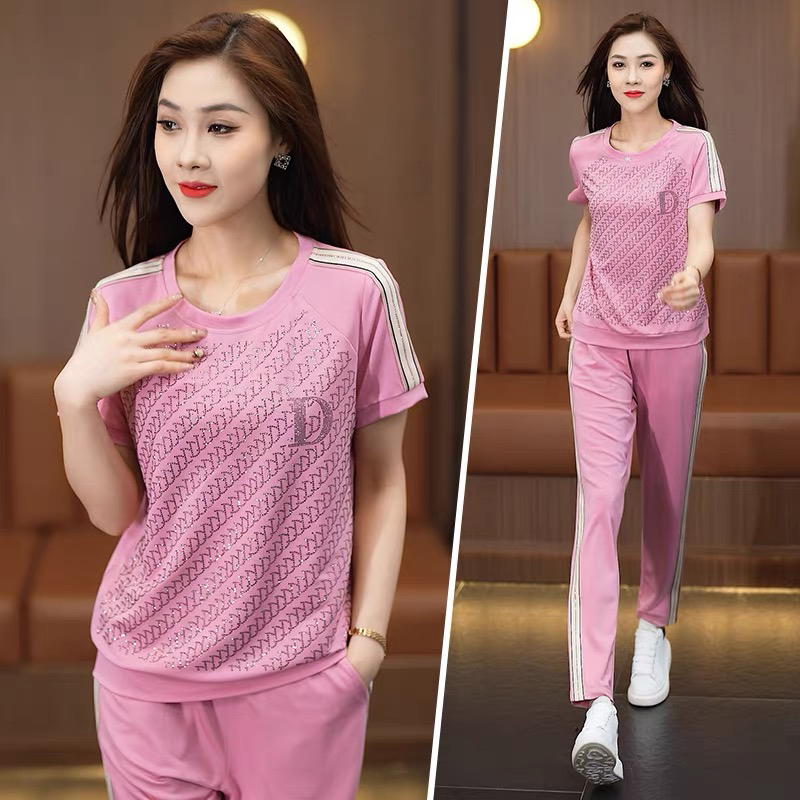 BY12869# 夏季运动服套装女新款时尚烫钻韩系慵懒潮牌短袖薄款休闲衣服 服裝批發女裝批發服飾貨源