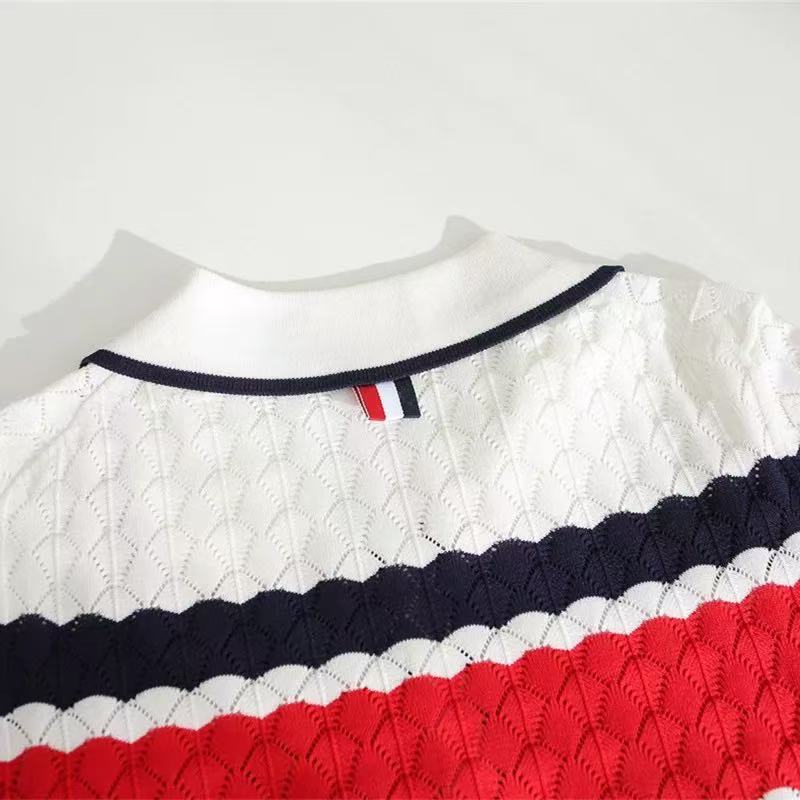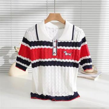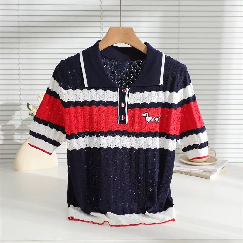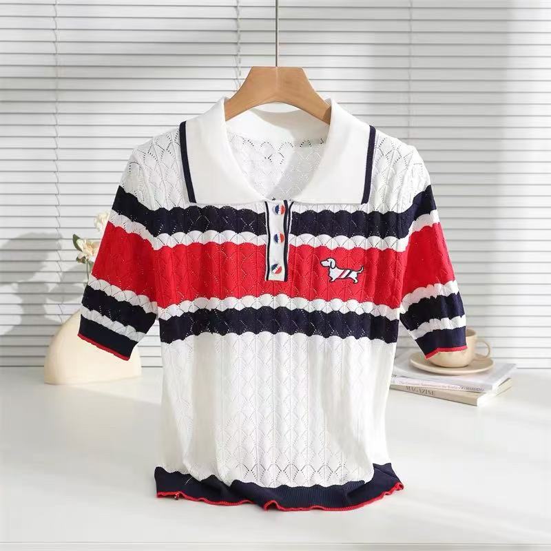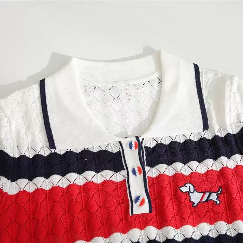 BY12872# 撞色翻领小狗刺绣针织衫镂空显瘦上衣春夏新款针织短袖女 服裝批發女裝批發服飾貨源
