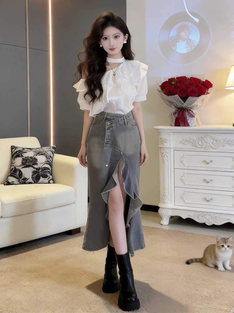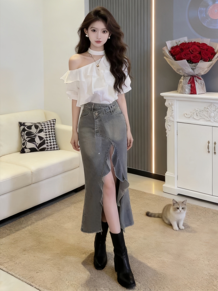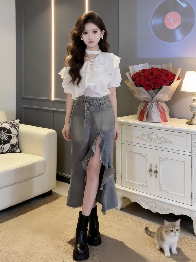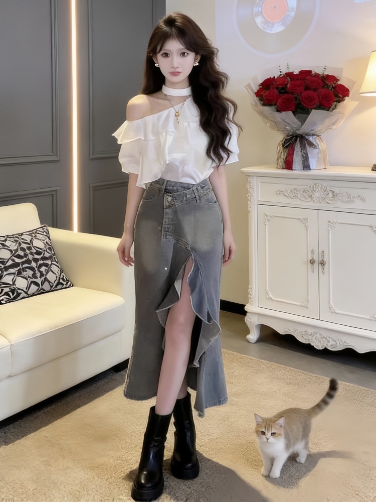 BY12933# 夏季新款高级感纯欲风荷叶边露肩上衣牛仔裙独特漂亮两件套女 服裝批發女裝批發服飾貨源