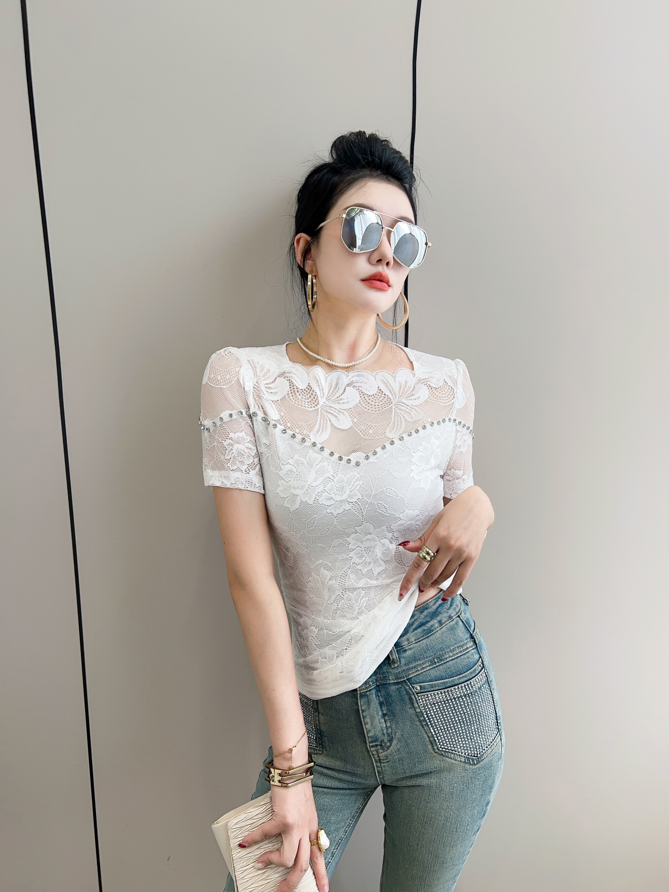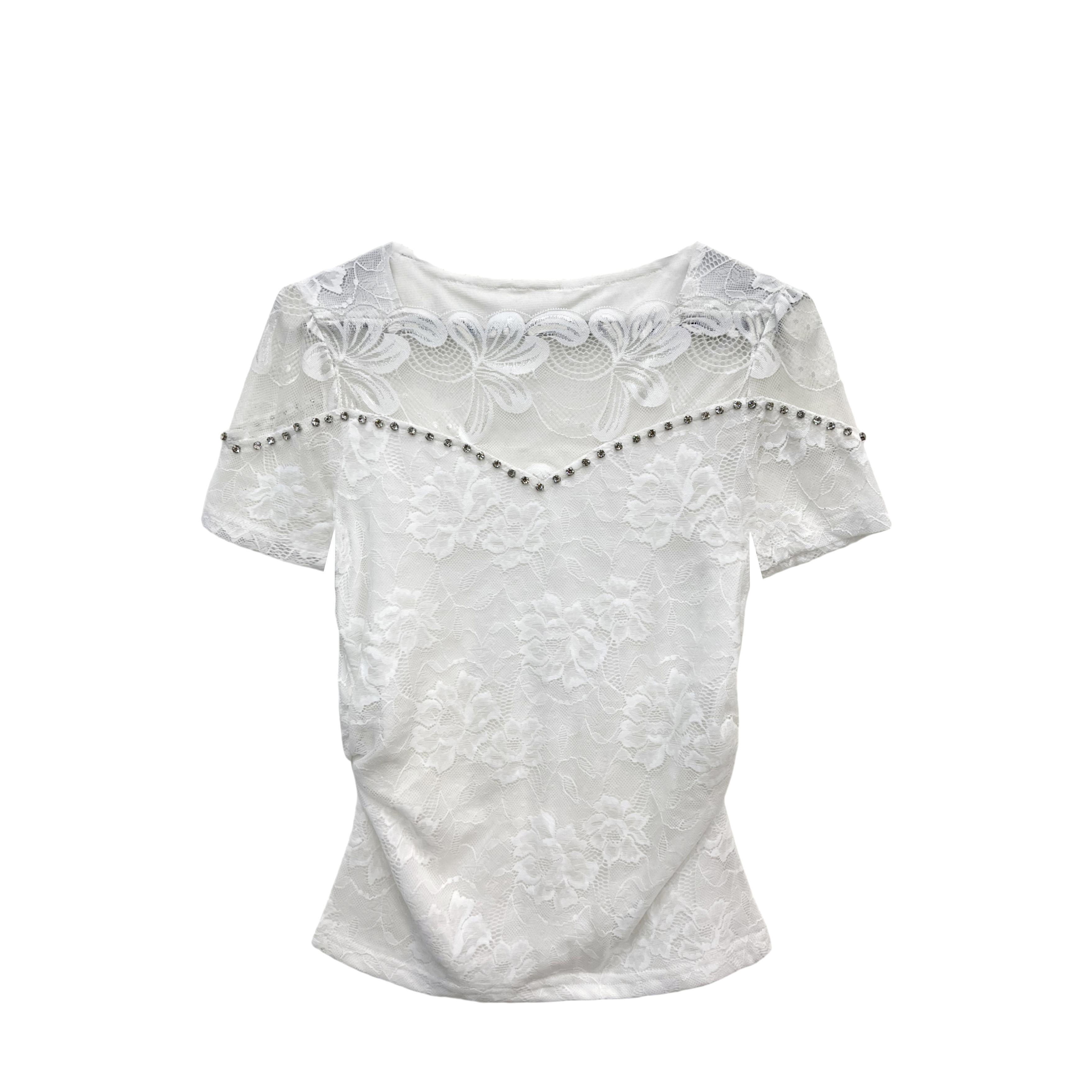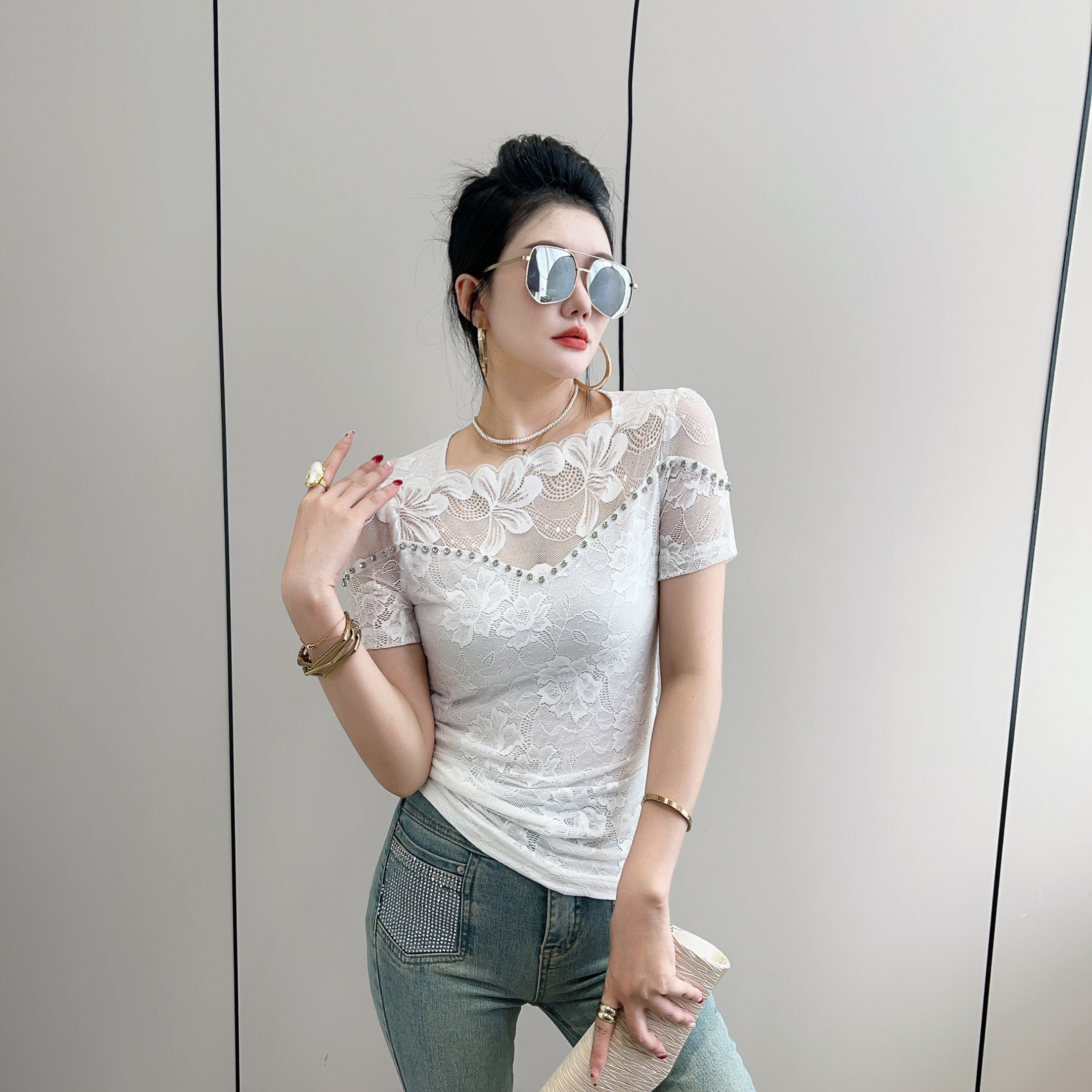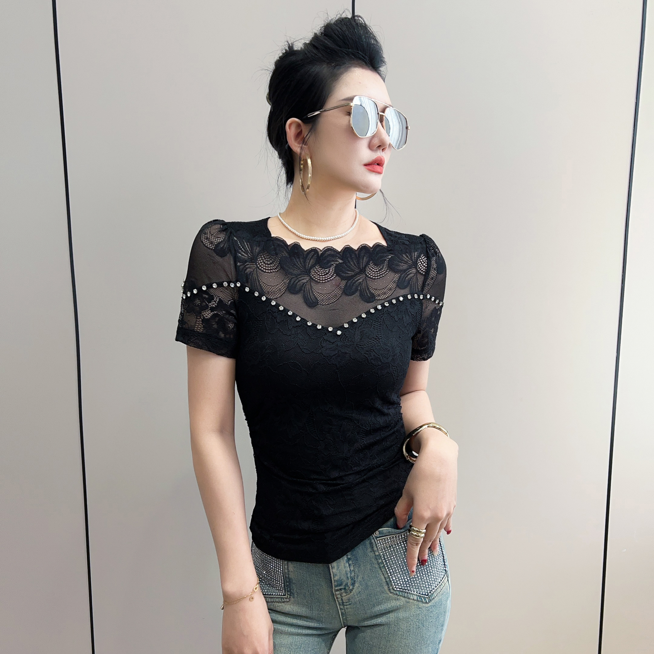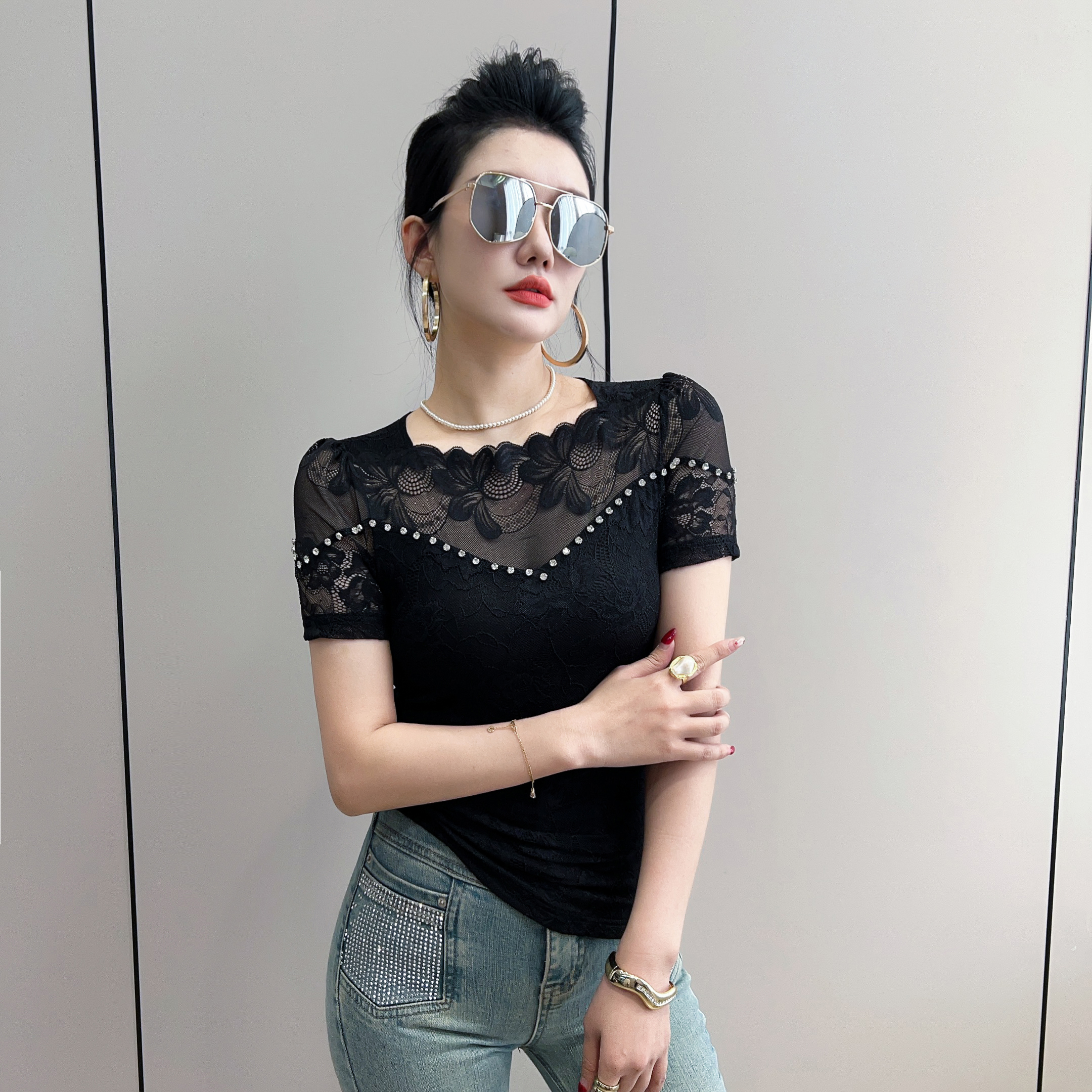 BY13878# 绝美一字肩花边钉钻短袖蕾丝打底衫女夏修身显瘦性感镂空网纱t恤 服裝批發女裝批發服飾貨源