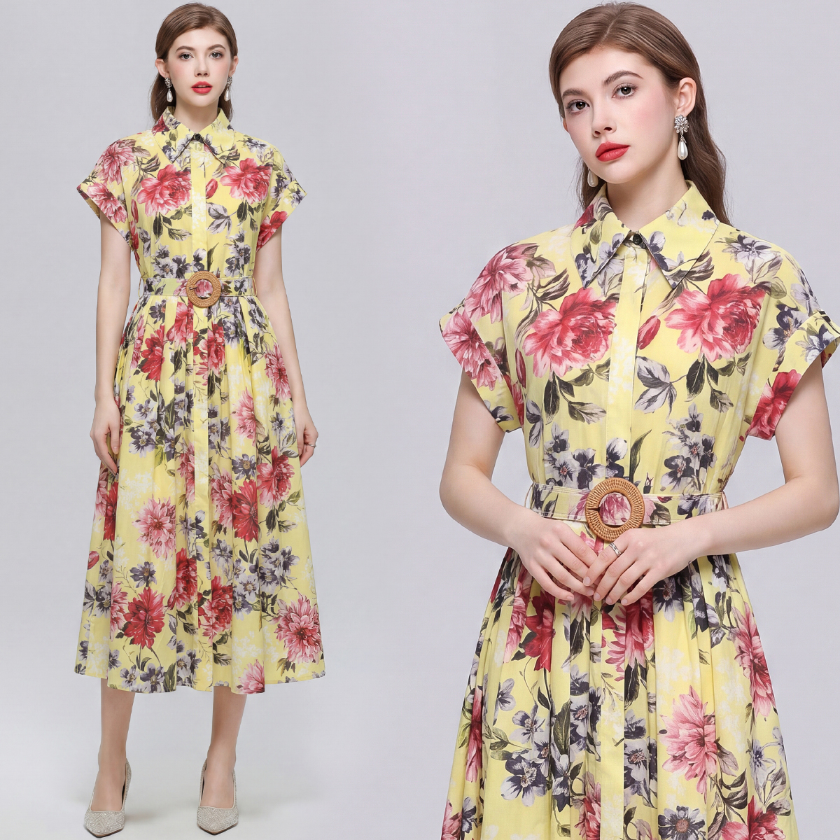 BY18286# 优雅气质衬衫翻领连衣裙女收腰显瘦中长休闲印花裙子送腰带 服裝批發女裝批發服飾貨源